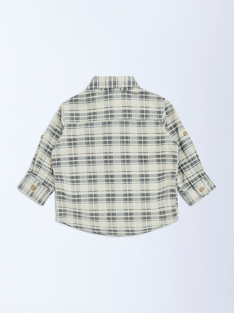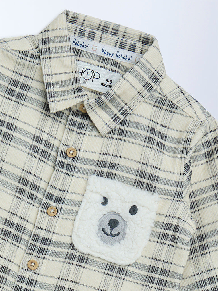 Define your little one’s casual style with this cream checked shirt from HOP Baby. Created from pure cotton for all-day comfort, it’s designed with a classic collar, button placket and full sleeves for a neat finish. The chest pocket is accented with an adorable bear design, adding a sweet touch to this everyday favourite.