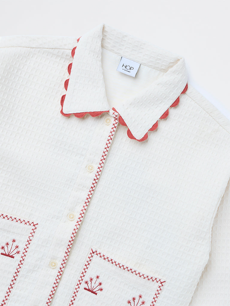 HOP Kids Girls Cream Textured Embroidered Cotton Shirt