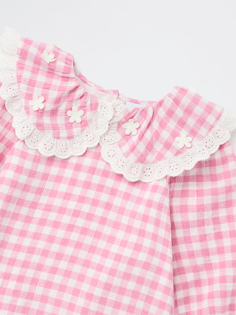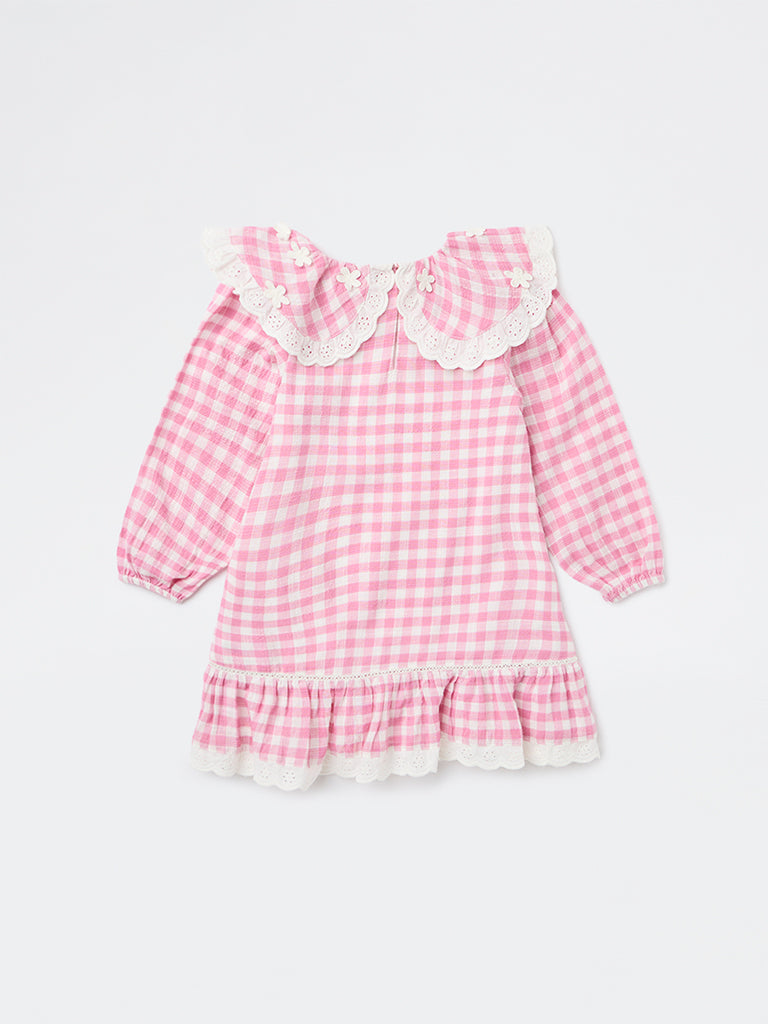 HOP Kids presents this light pink check dress for girls, crafted from pure cotton for soft, breathable comfort. Designed with a classic Peter Pan collar and three-quarter sleeves, it carries a timeless, charming appeal. The lace-detailed ruffled hemline adds a playful, twirl-ready finish, making it perfect for casual outings and special occasions alike.
