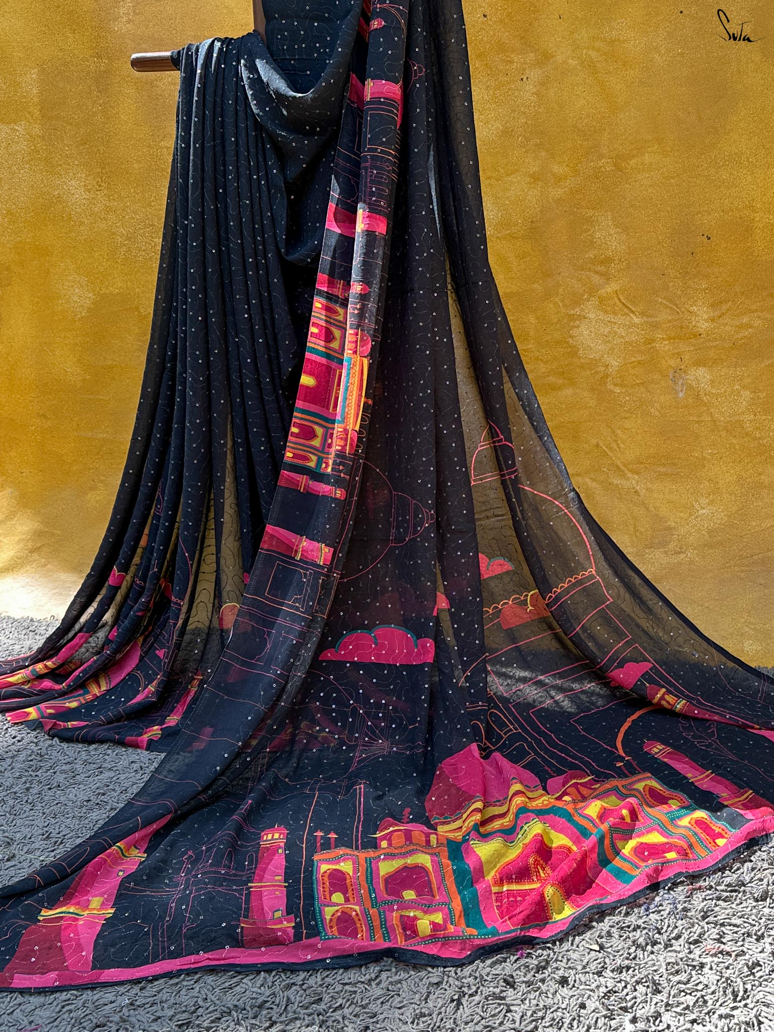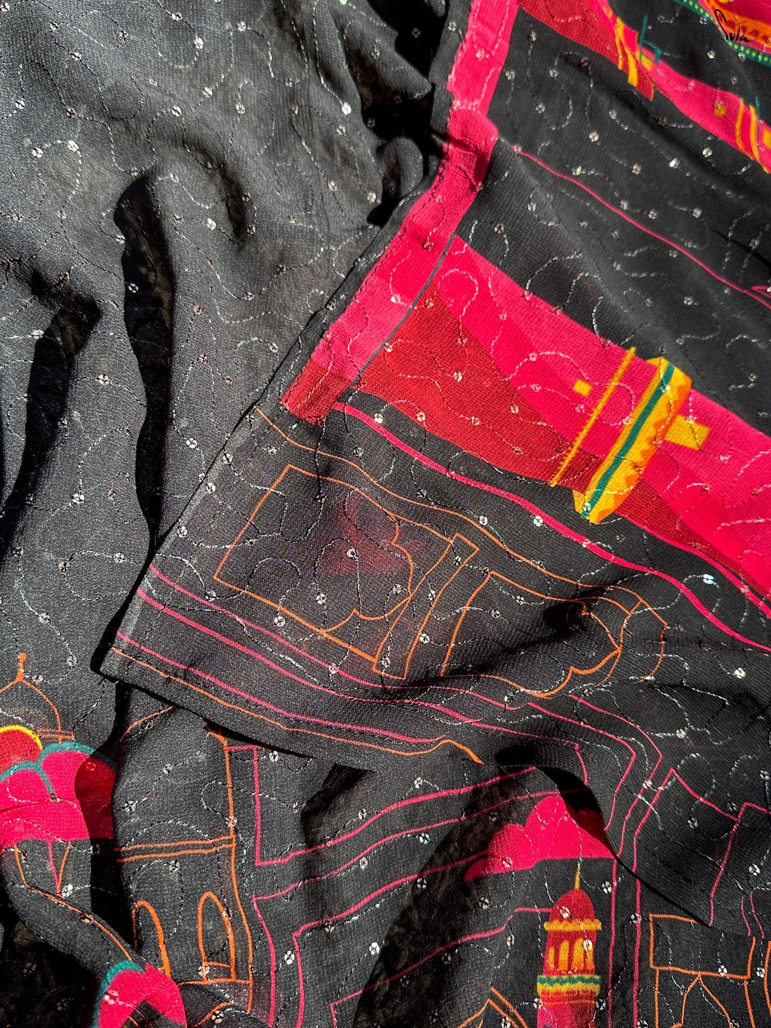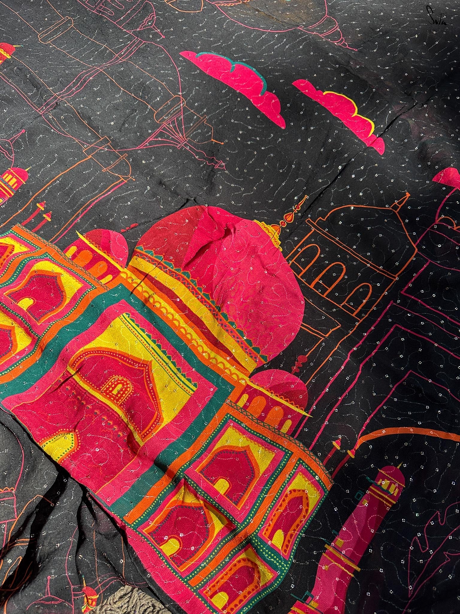The base fabric for this product is georgette. This fabric is made with highly twisted threads to get that crinkly, sheer feel that is so beautiful and versatile.