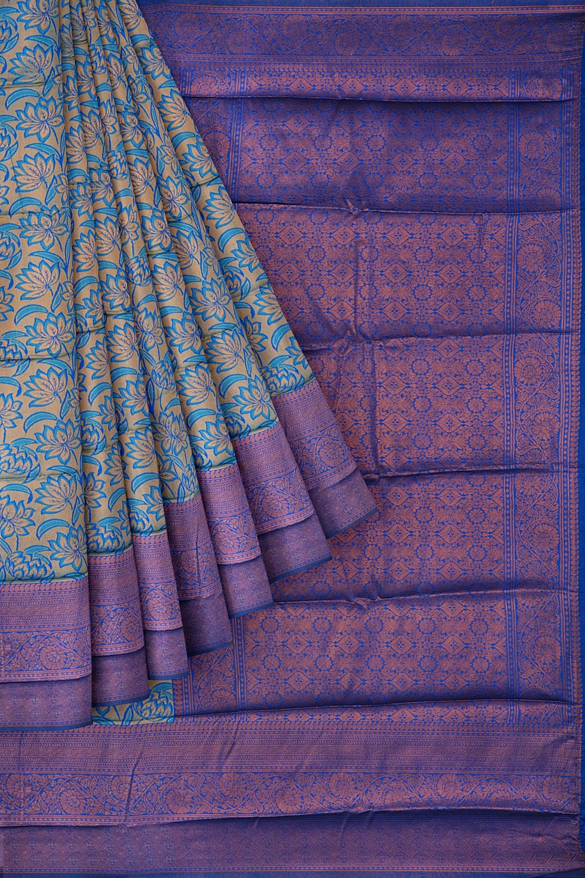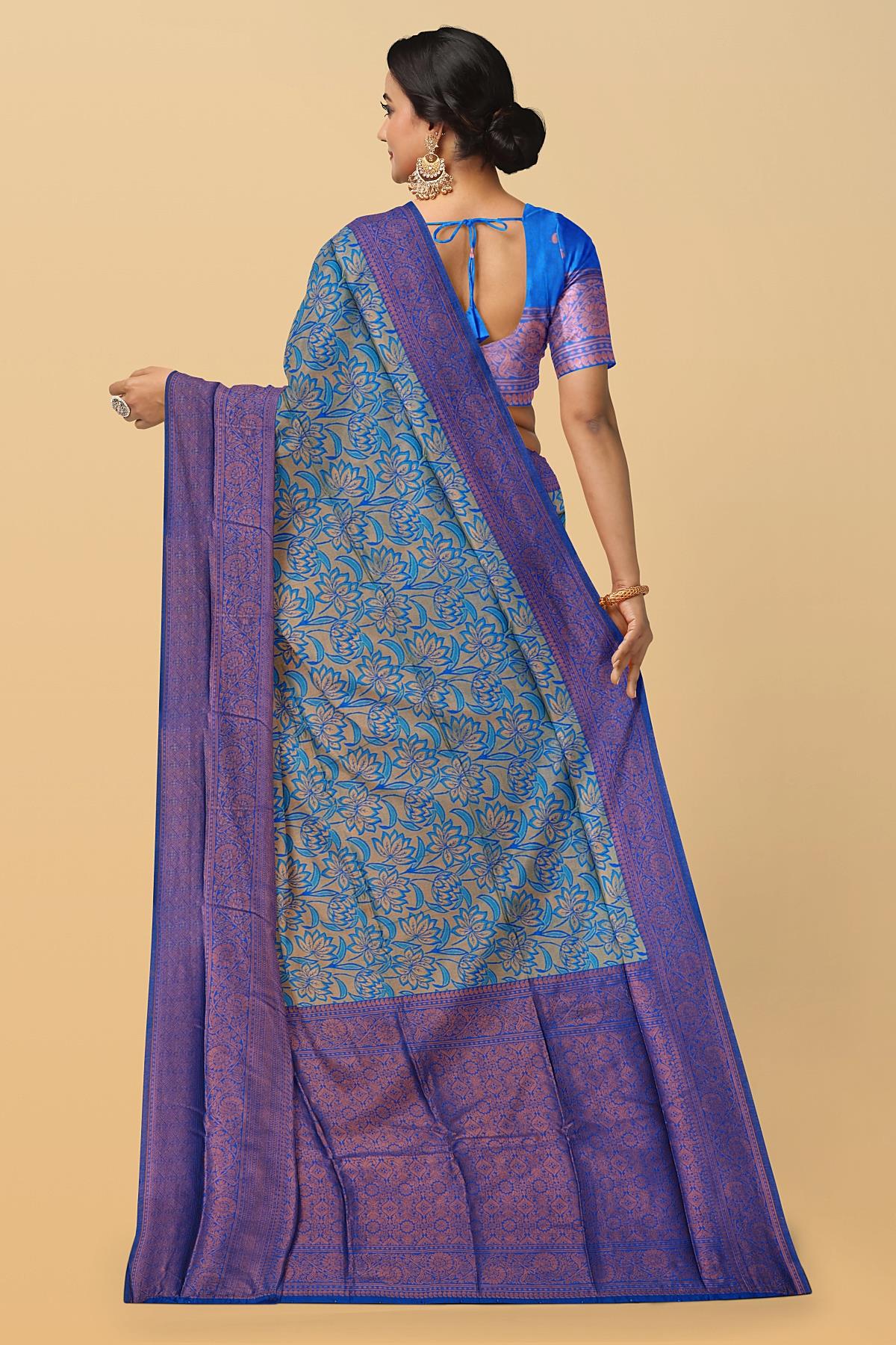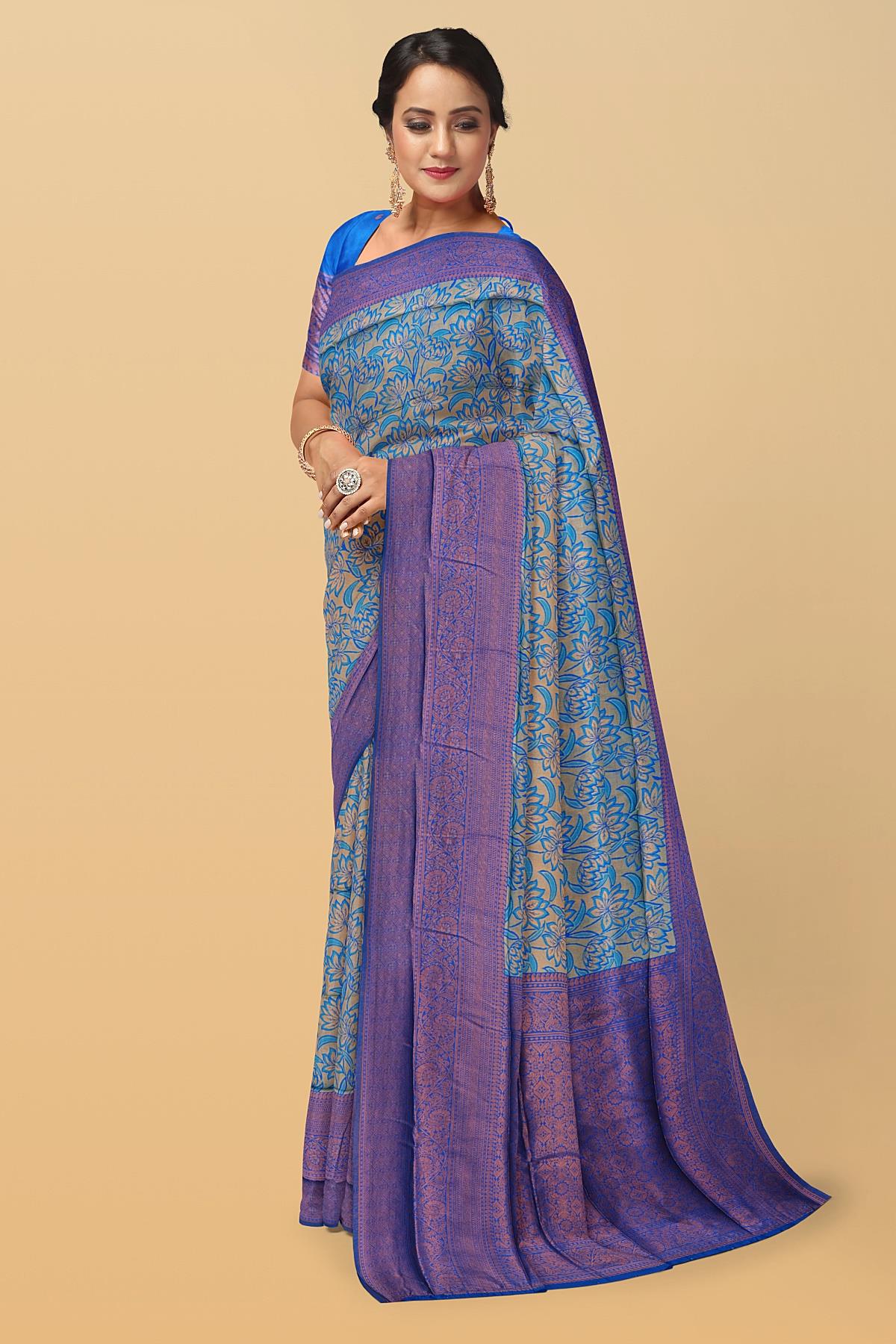 Latest LIGHT BLUE FLORALS SILK Saree with CONTRAST ZARI border. This saree comes with CONTRAST WITH BORDER SILK blouse.