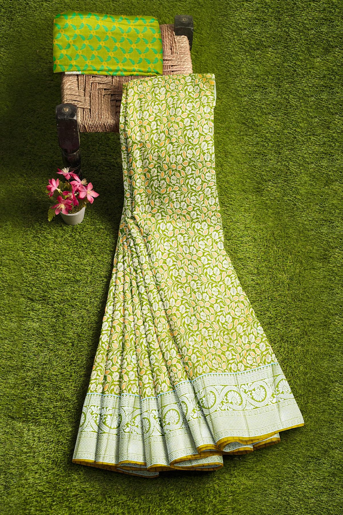 Latest LIGHT GREEN FLORAL JAAL SILK BLEND Saree with SELF ZARI border. This saree comes with EMBOSE SILK BLEND blouse.