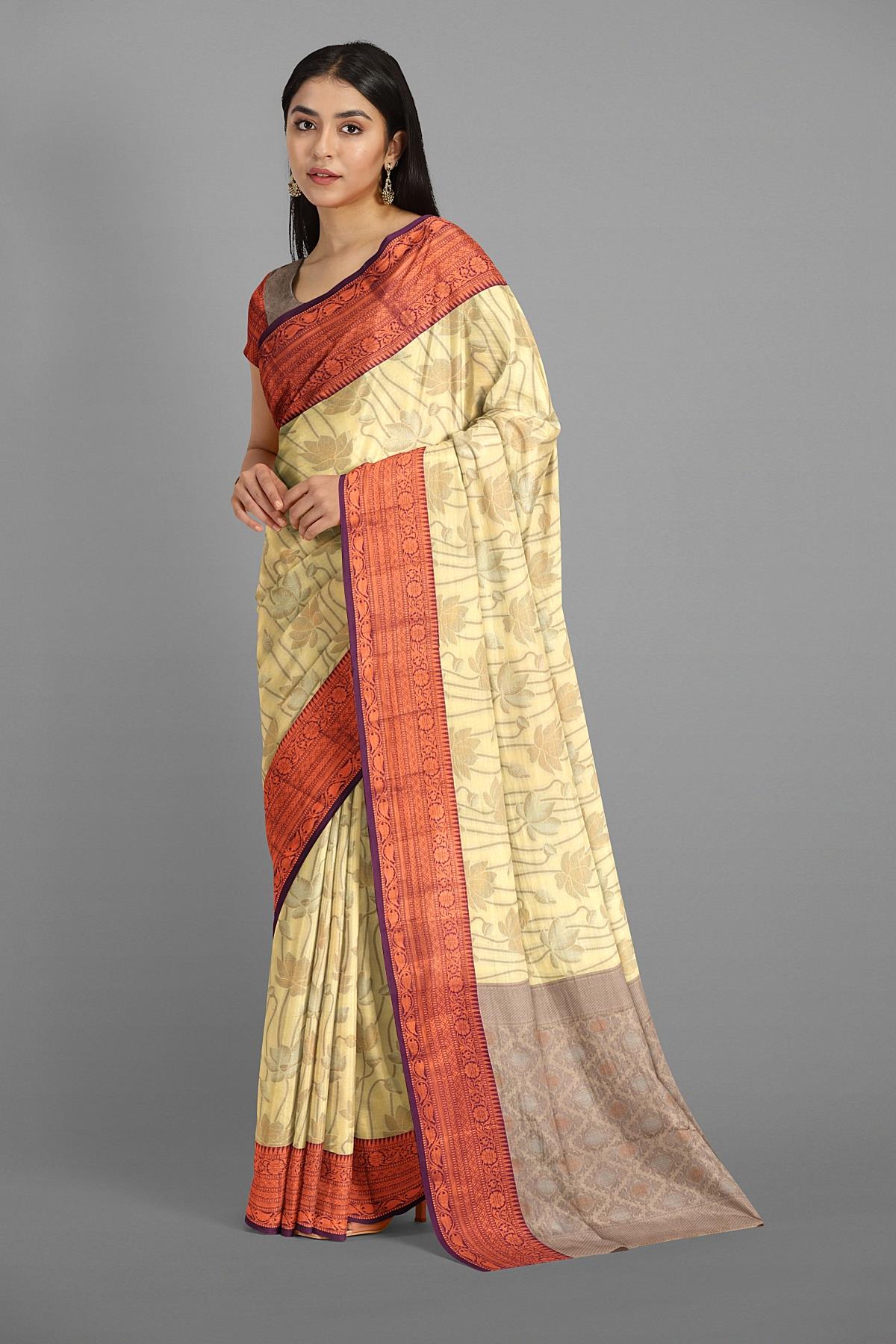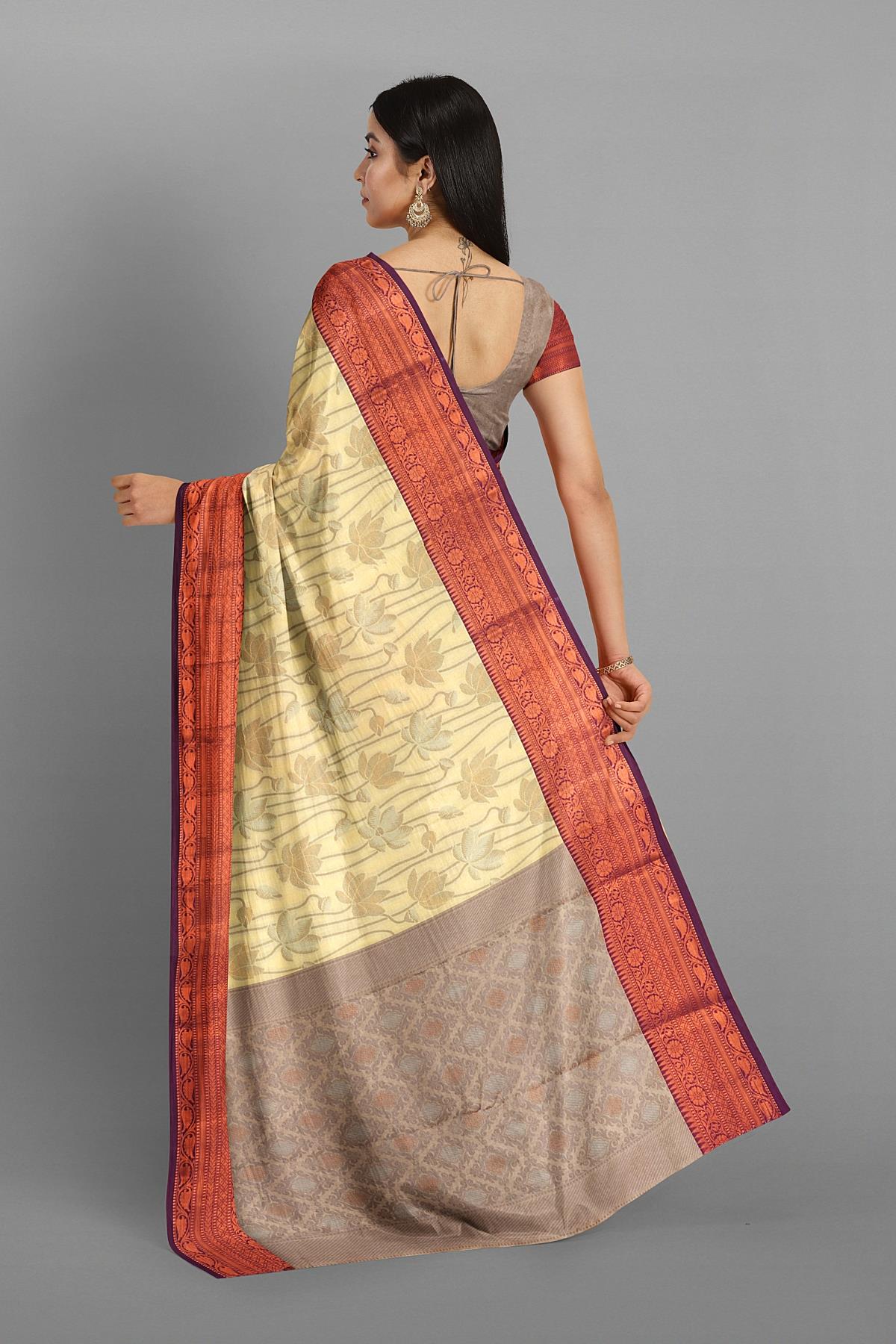 Latest LIGHT YELLOW FLORAL JAAL WARM SILK Saree with CONTRAST border. This saree comes with CONTRAST WITH BORDER SILK blouse.