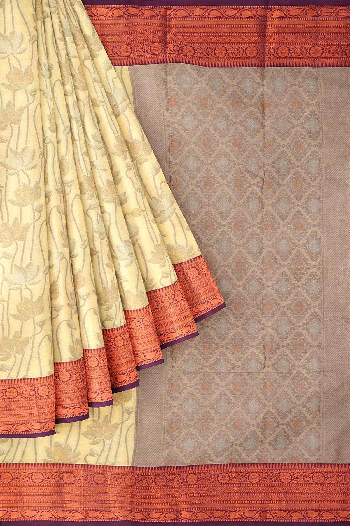 LIGHT YELLOW and PURPLE FLORAL JAAL WARM SILK Saree with BANARASI FANCY