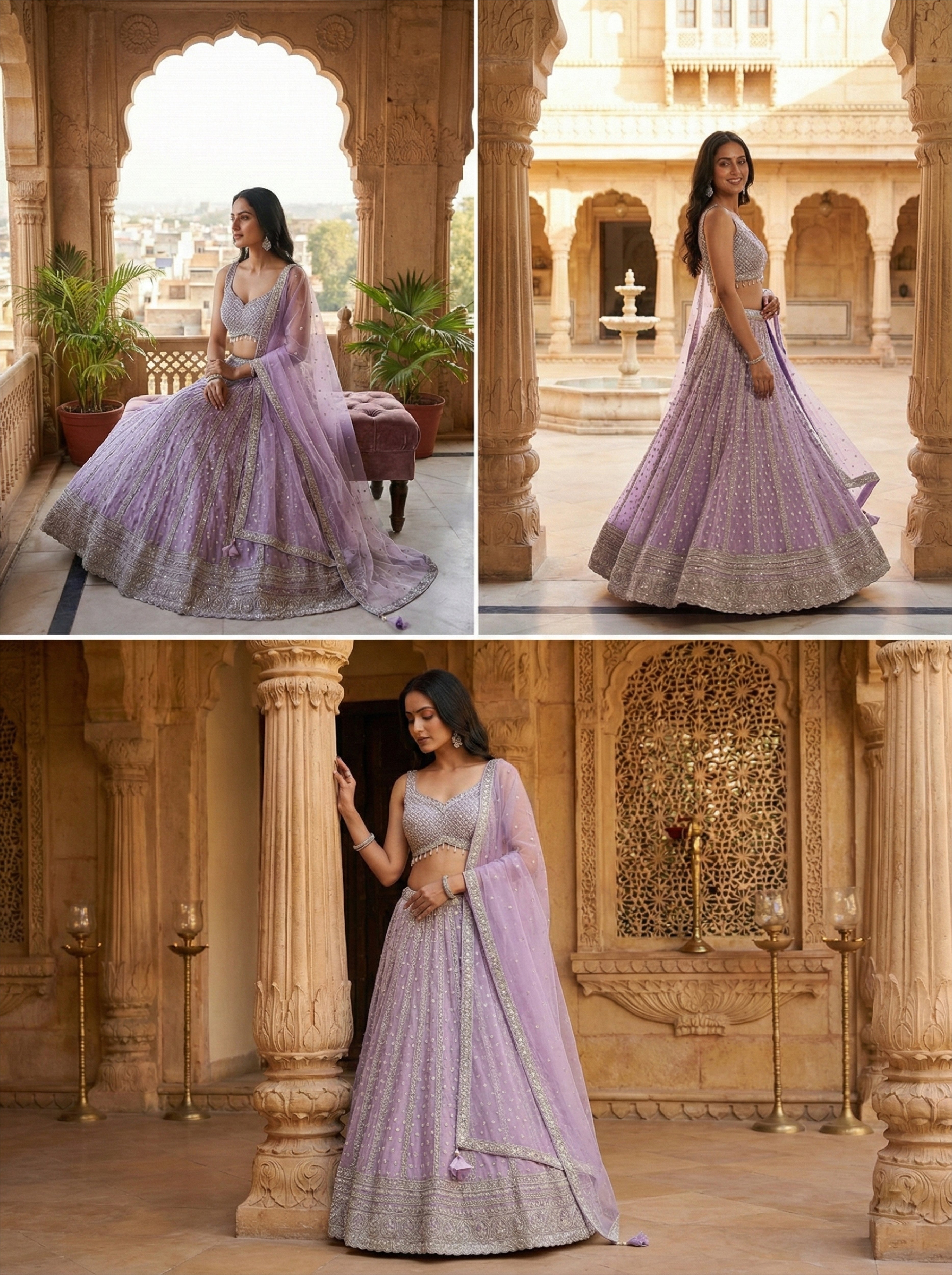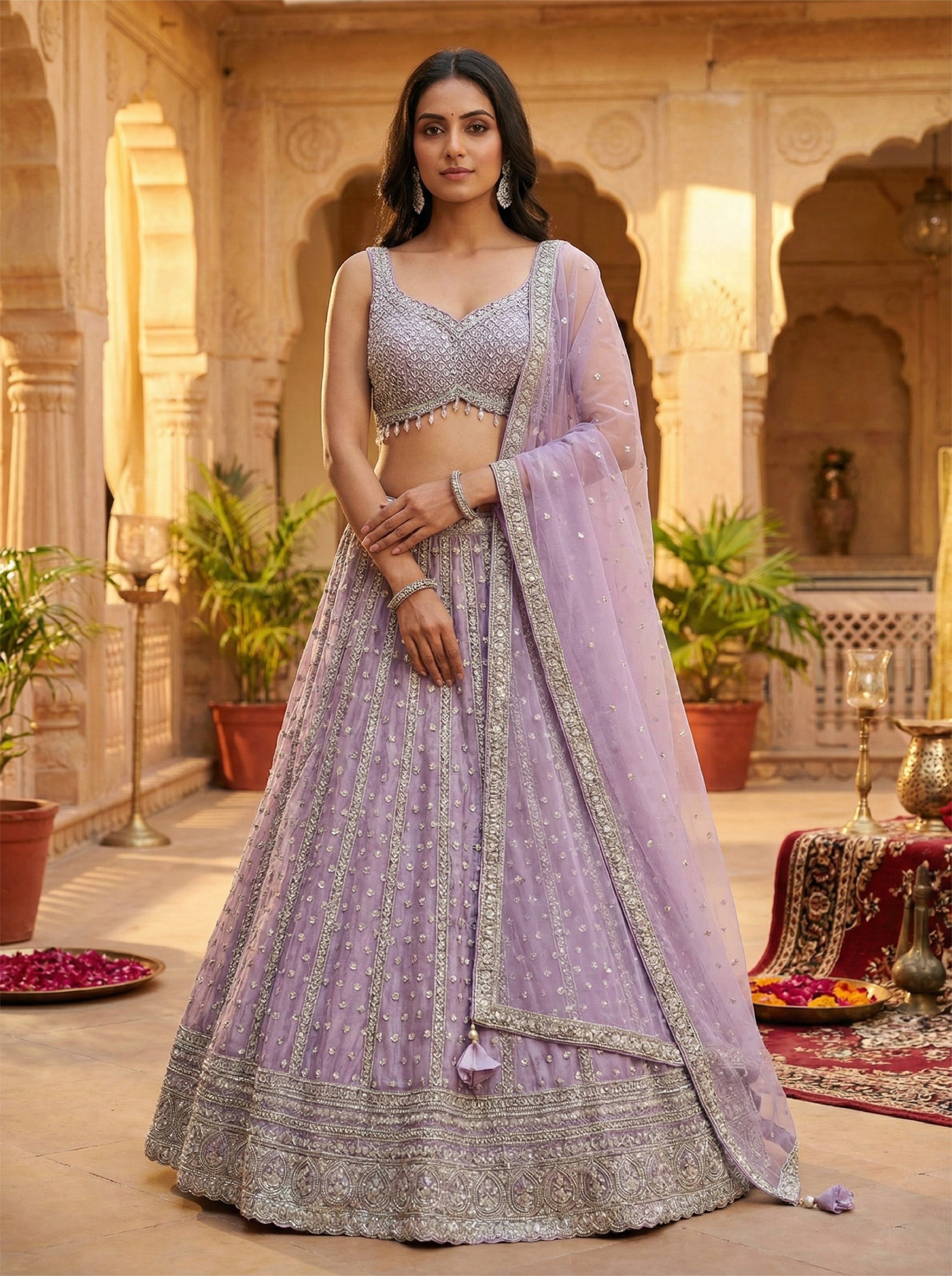 Elevate your festive wardrobe with this stunning lilac ghagra set, crafted from delicate net fabric adorned with heavy sequins and intricate hand embroidery. Each piece is meticulously designed to capture light beautifully, creating an enchanting shimmer with every movement. The rich lilac hue complements all skin tones, while the detailed embroidery work showcases traditional craftsmanship. Perfect for weddings, celebrations, and special occasions, this set combines timeless elegance with contemporary sparkle. Embrace the artistry and grace of this exquisite ensemble that promises to make you feel absolutely radiant.