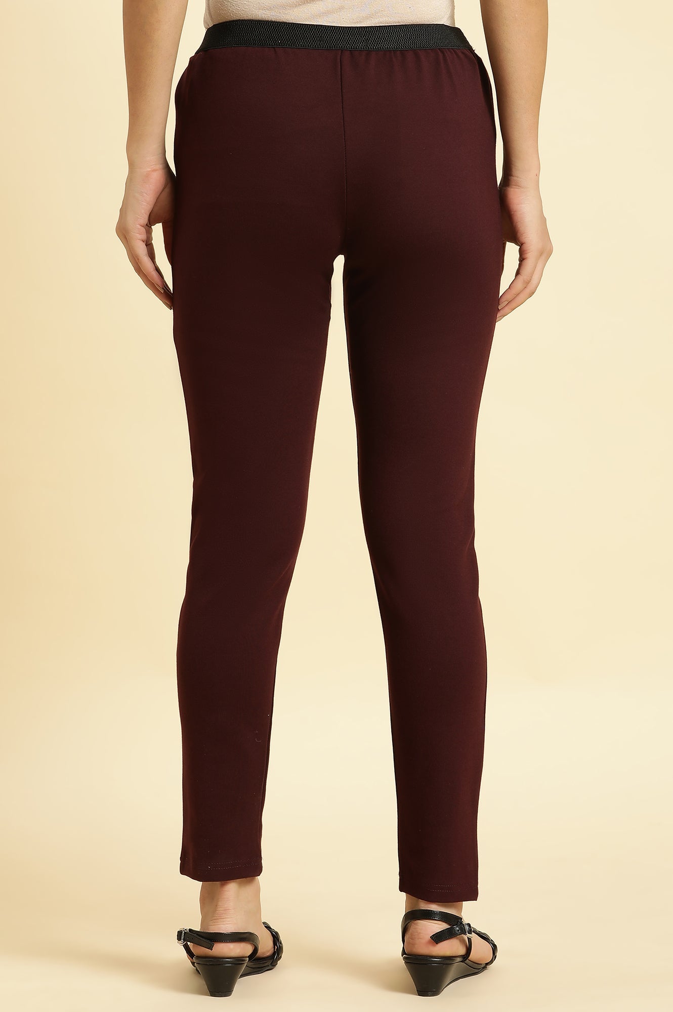 Tailored for effortless comfort, these slim-fit leggings for women in Wine exude casual elegance. Designed with a mid-rise waistband, the straight-leg silhouette offers a flattering fit that moves with you. Crafted from soft rayon fabric, these leggings feature a smooth flat front style and a stretchable knitted texture for all-day ease. Perfect for casual outings, travel, or workout sessions, the ankle-length hem adds a touch of modernity. Pair them with a tank top or a kurta for versatile styling options.