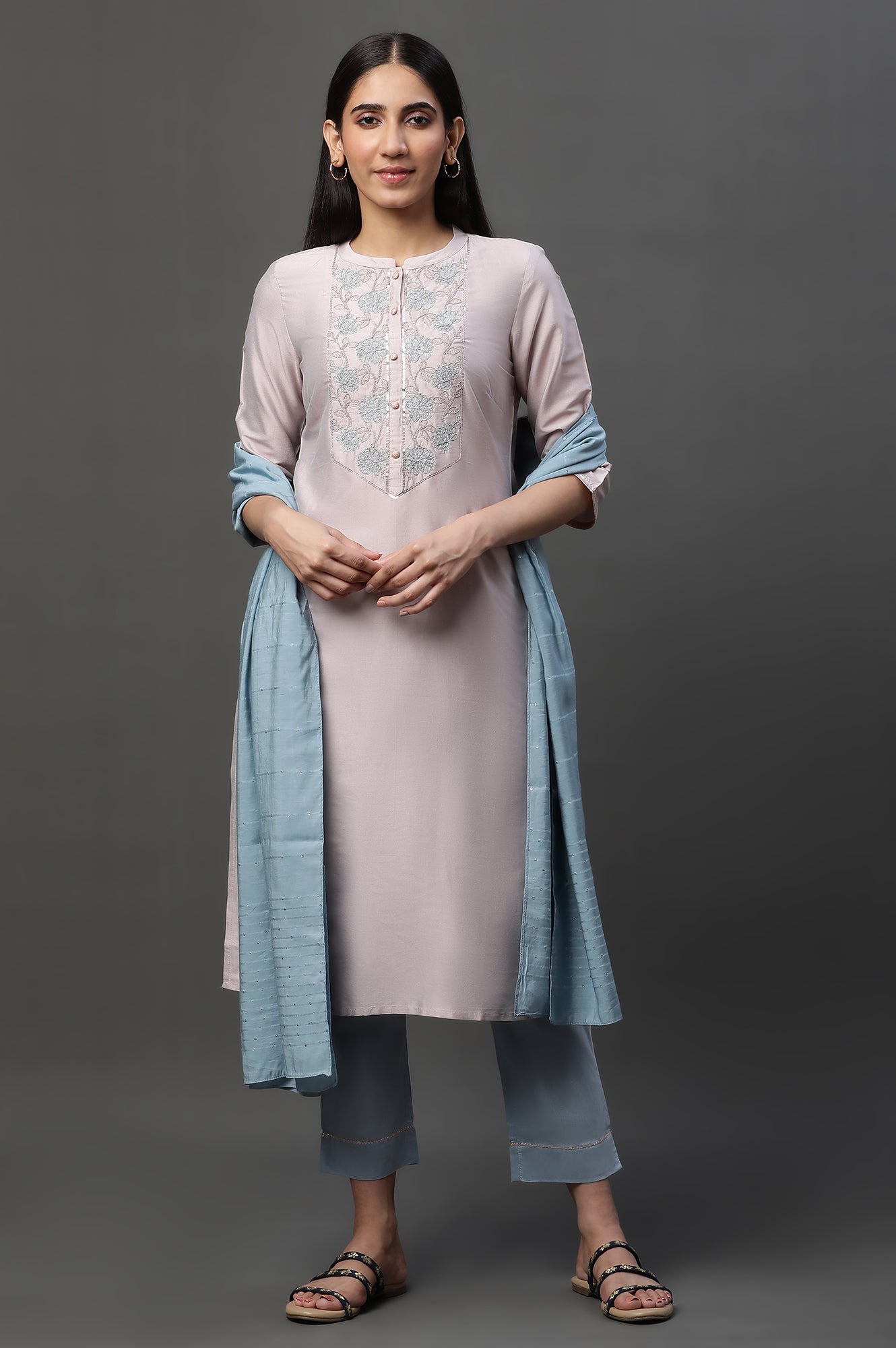 Step into understated elegance with this mauve pink embroidered kurta, pants, and dupatta set from Aurelia.