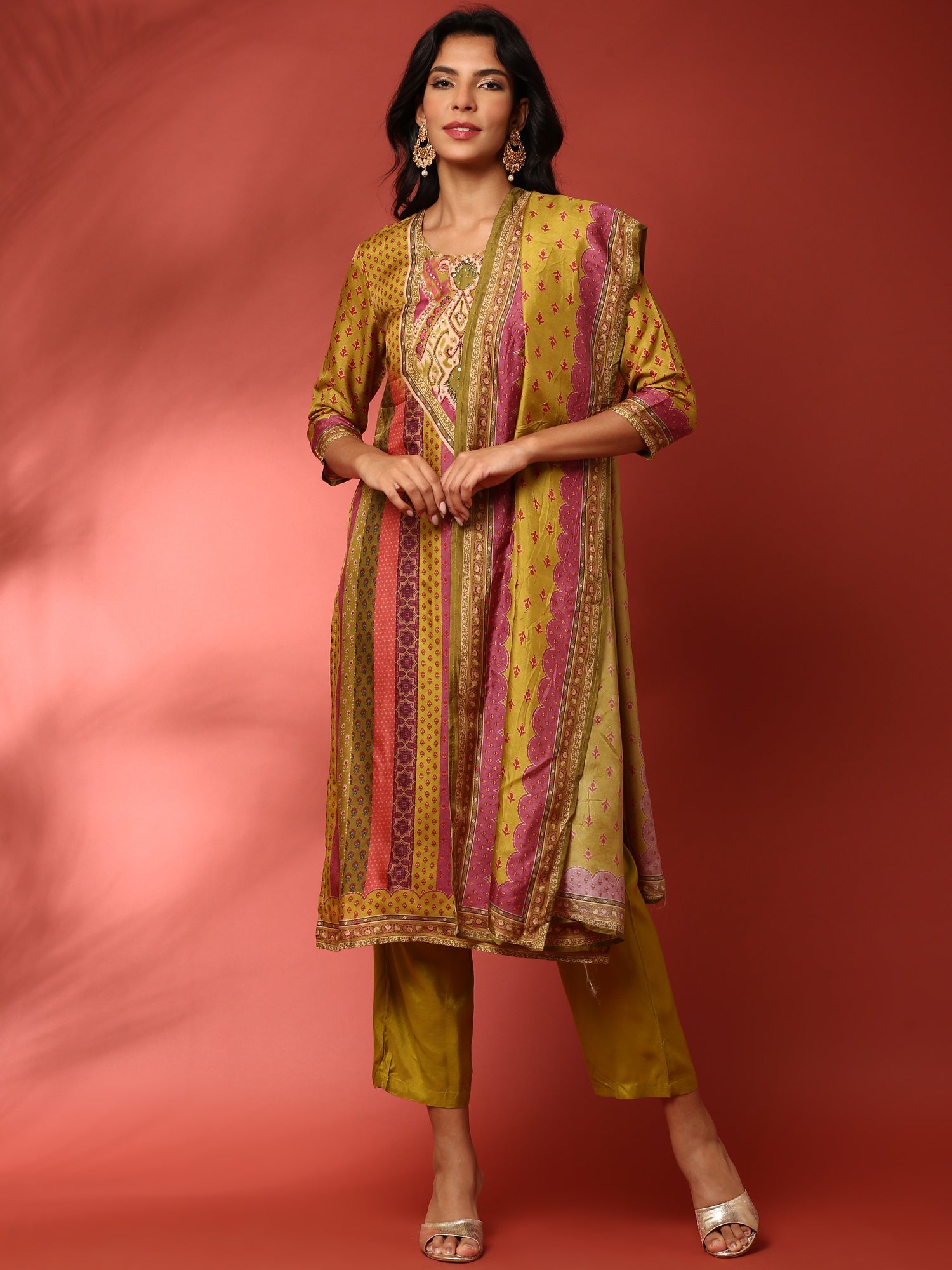 Elevate your wardrobe with this multi-color Muslin three-piece suit set, featuring digitally printed designs that combine tradition with modern artistry. Crafted from soft, breathable Muslin fabric, it ensures comfort throughout the day. The vibrant digital print adds a contemporary flair while maintaining the elegance of classic ethnic wear. Ideal for festive occasions or formal gatherings, this set offers versatility and a refined look with coordinated pieces that fit seamlessly together. Experience unmatched style and comfort in one thoughtfully designed ensemble.