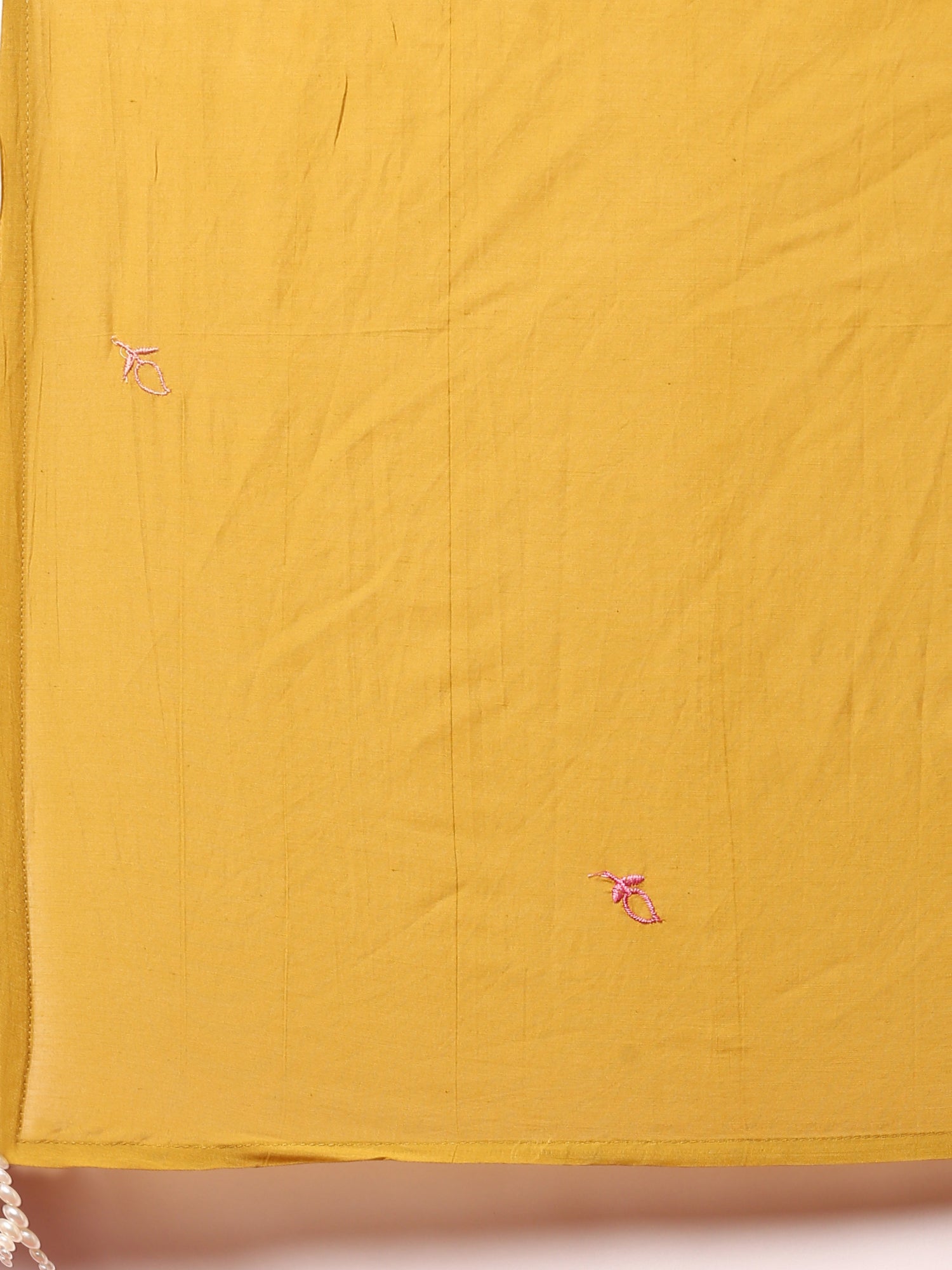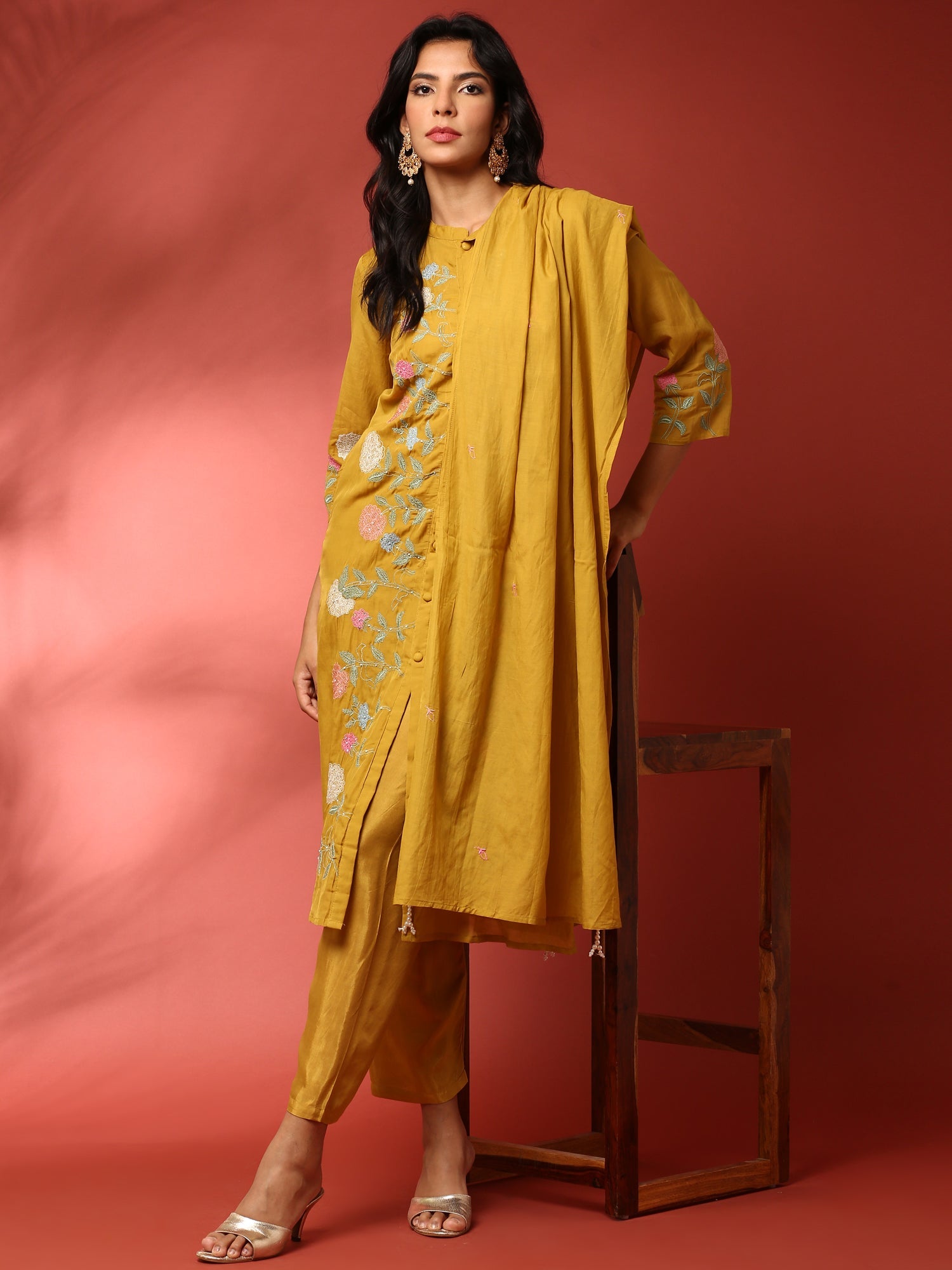 Muslin Mustard Resham embroidered three piece suit set