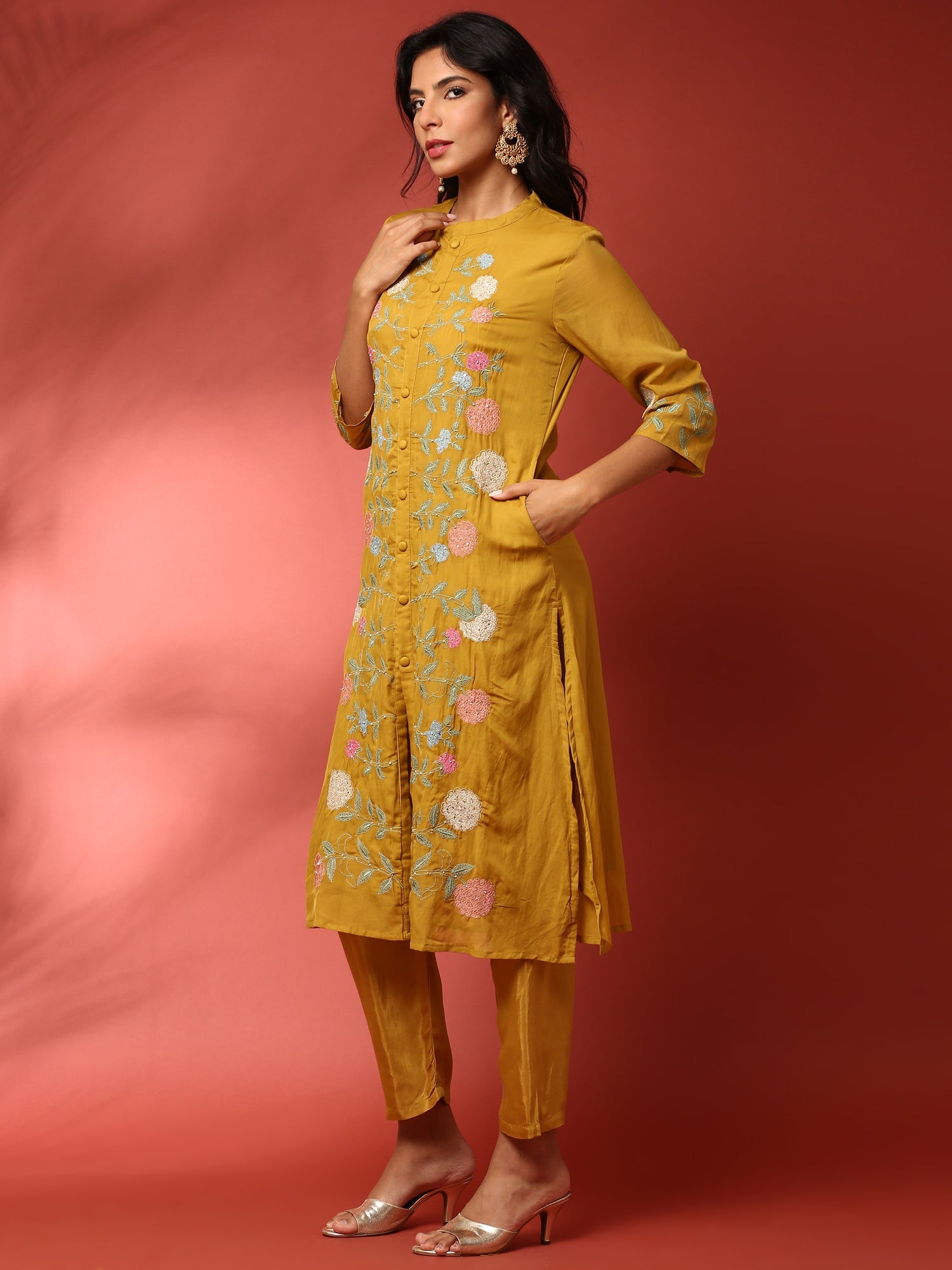 This Muslin Mustard Resham embroidered three-piece suit set showcases expert craftsmanship evident in its intricate threadwork. The muslin fabric offers exceptional breathability and comfort, ideal for all-day wear. Its vibrant mustard hue enhances the delicate Resham embroidery, creating a sophisticated and elegant ensemble. Complete with matching components, this set combines traditional artistry with modern style, perfect for formal occasions or festive gatherings.