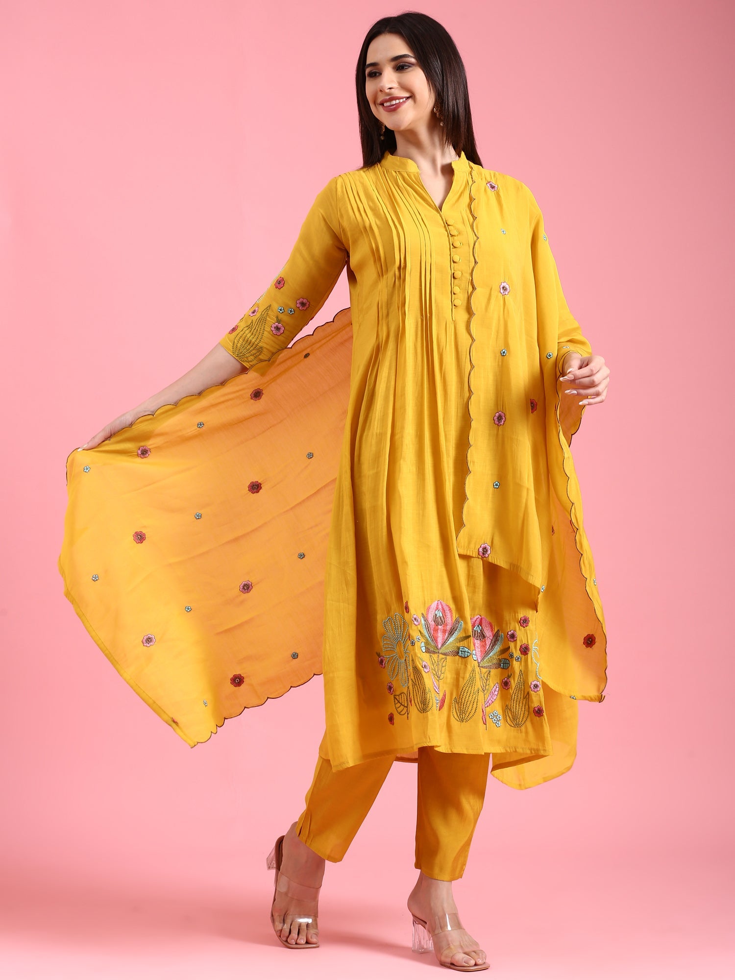 Mustard Chanderi Embroidery Aline Three Piece Suit Set