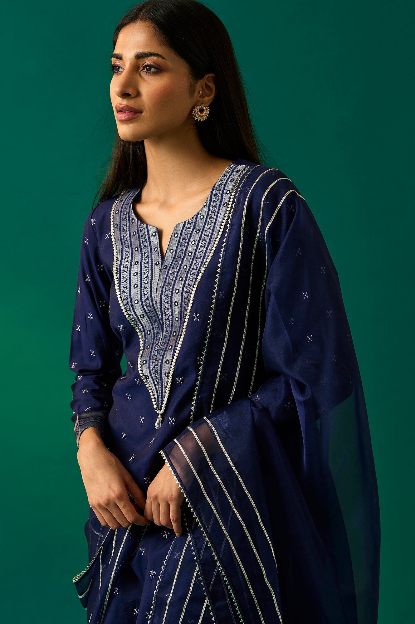 A timeless blend of elegance and tradition, this navy blue kurta set for women is a perfect choice for festive occasions. The kurta features intricate geometric embroidery on the yoke and cuffs, paired with a straight silhouette that exudes sophistication. The calf-length kurta is complemented by relaxed-fit striped Straight Pant and a contrasting geometric printed dupatta with tassel detailing. The V-neckline adds a touch of modernity, while the delicate embroidery enhances its ethnic charm. Crafted from fabric, this ensemble is both comfortable and stylish, making it ideal for celebrations and festive gatherings. Slip into this exquisite set and let its artistry elevate your festive wardrobe.