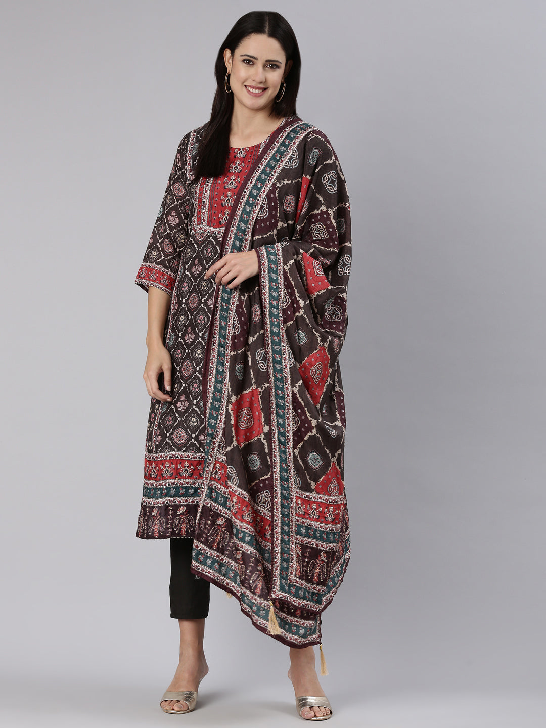 Neeru's Brown Regular, Straight-Cut Printed Readymade suits - A Sophisticated Combination Of Elegance And Style.