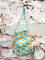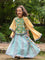 Skirt and top with bell sleeves in fine certified organic cotton; dupatta in cotton; hand block printed; set contains one lehanga skirt, top with bell sleeves, dupatta, and potli.