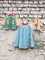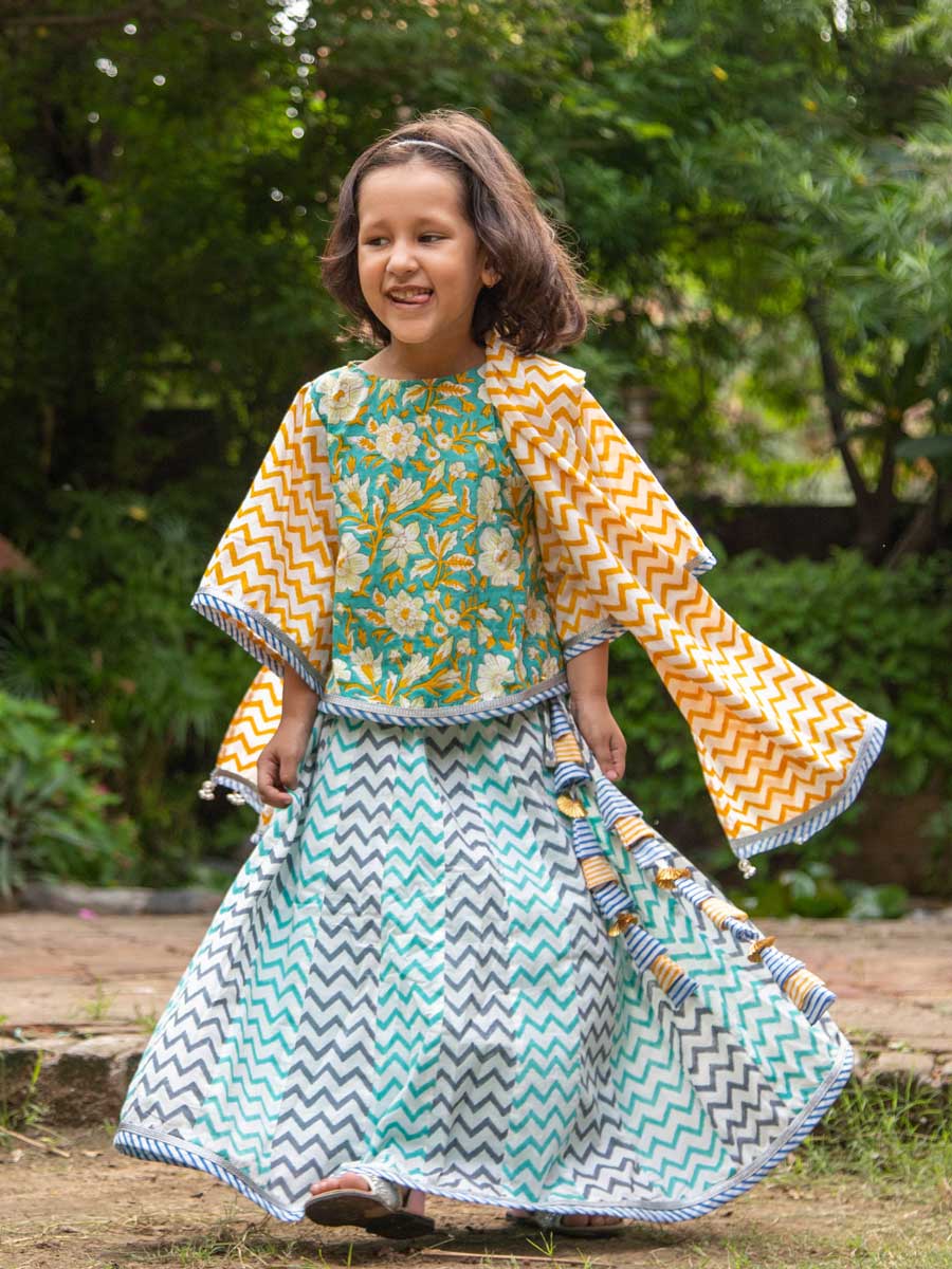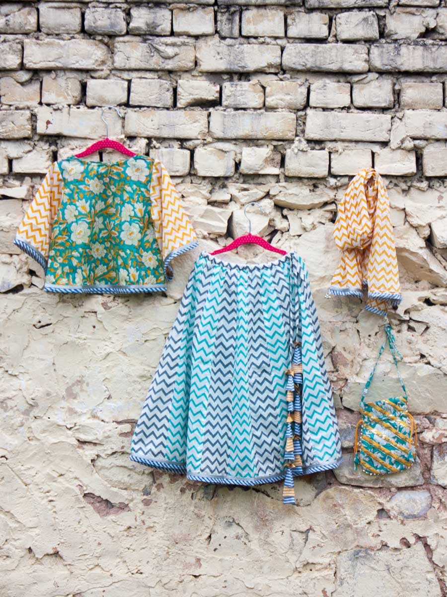 Ocean Wave Chevron Block Print Cotton Lehanga Set of 4