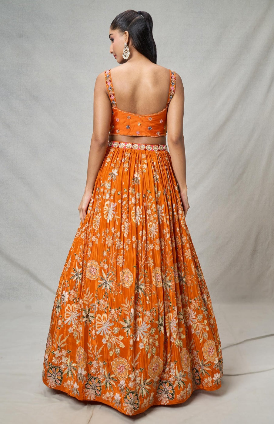 Crafted in rich orange silk, this lehenga features graceful floral prints enhanced with delicate hand-thread embroidery on both the blouse and lehenga. The blend of vibrant color, artisanal detailing, and timeless fabric makes it a perfect choice for festive occasions, weddings, and traditional celebrations.