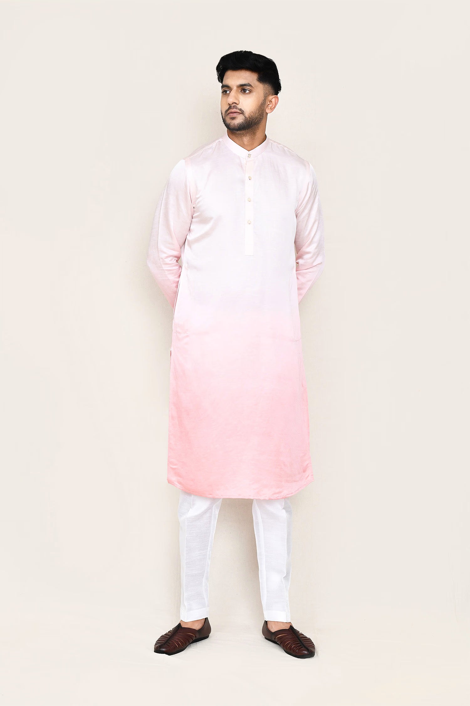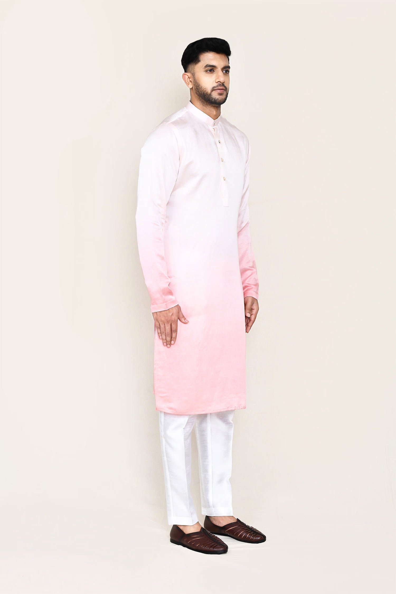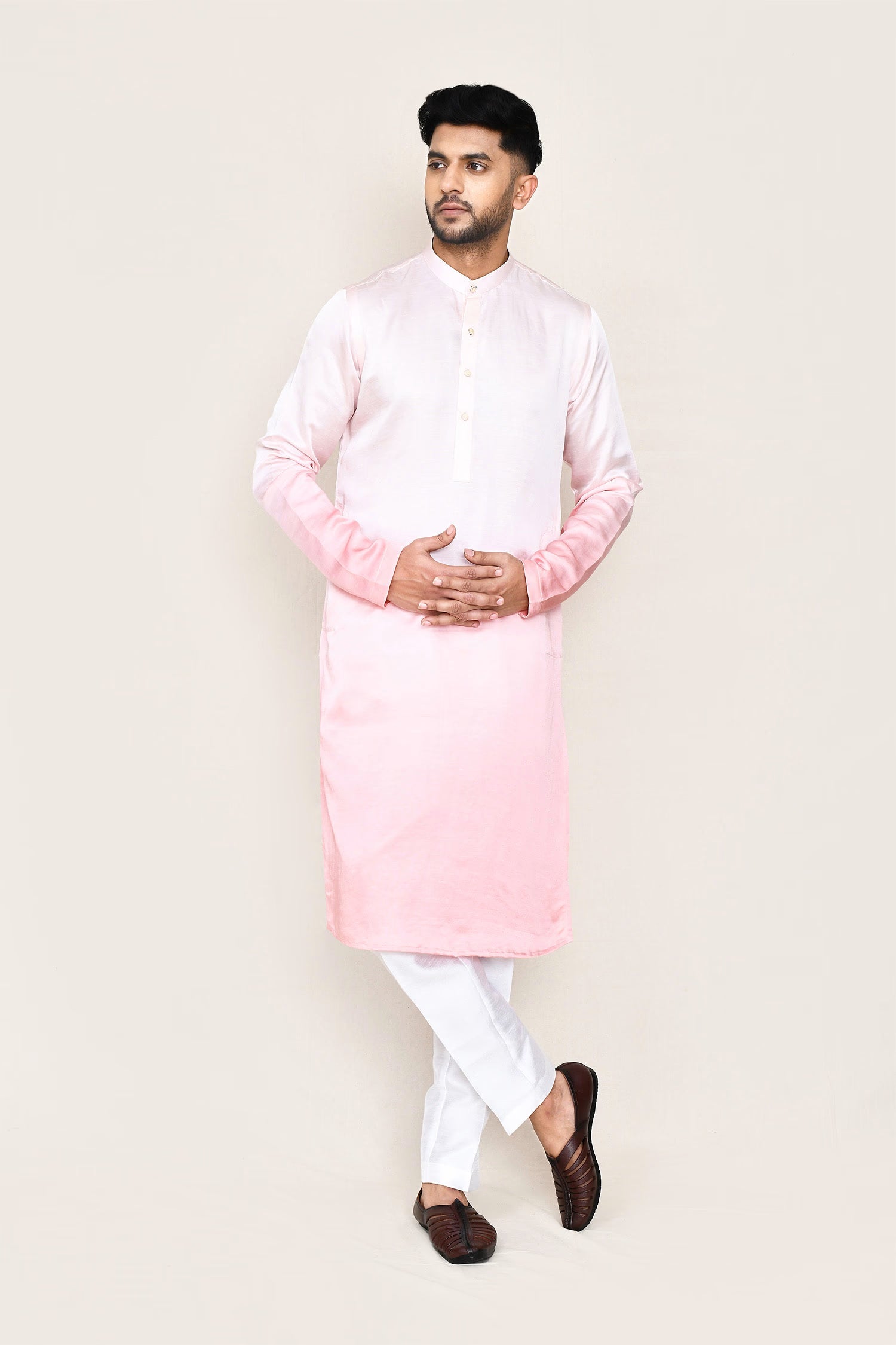 This pink gradient satin silk kurta set has silk base with collar neck and plain kurta paired with white silk pant, makes it simple and graceful to wear it at any occasion.