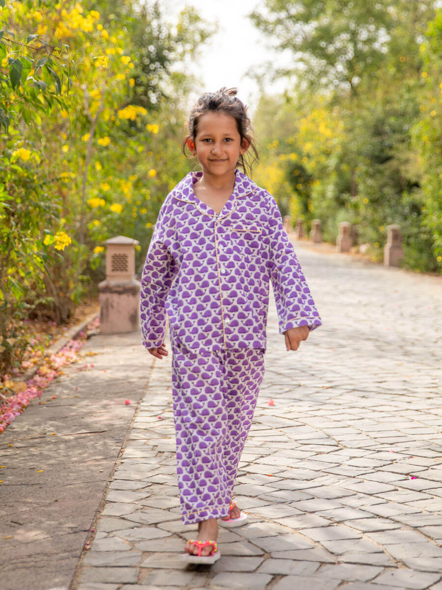 Purple Whale Block Printed Cotton Pyjama Set
