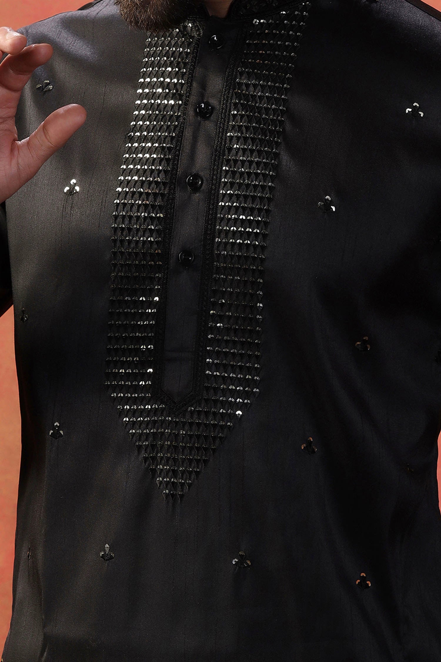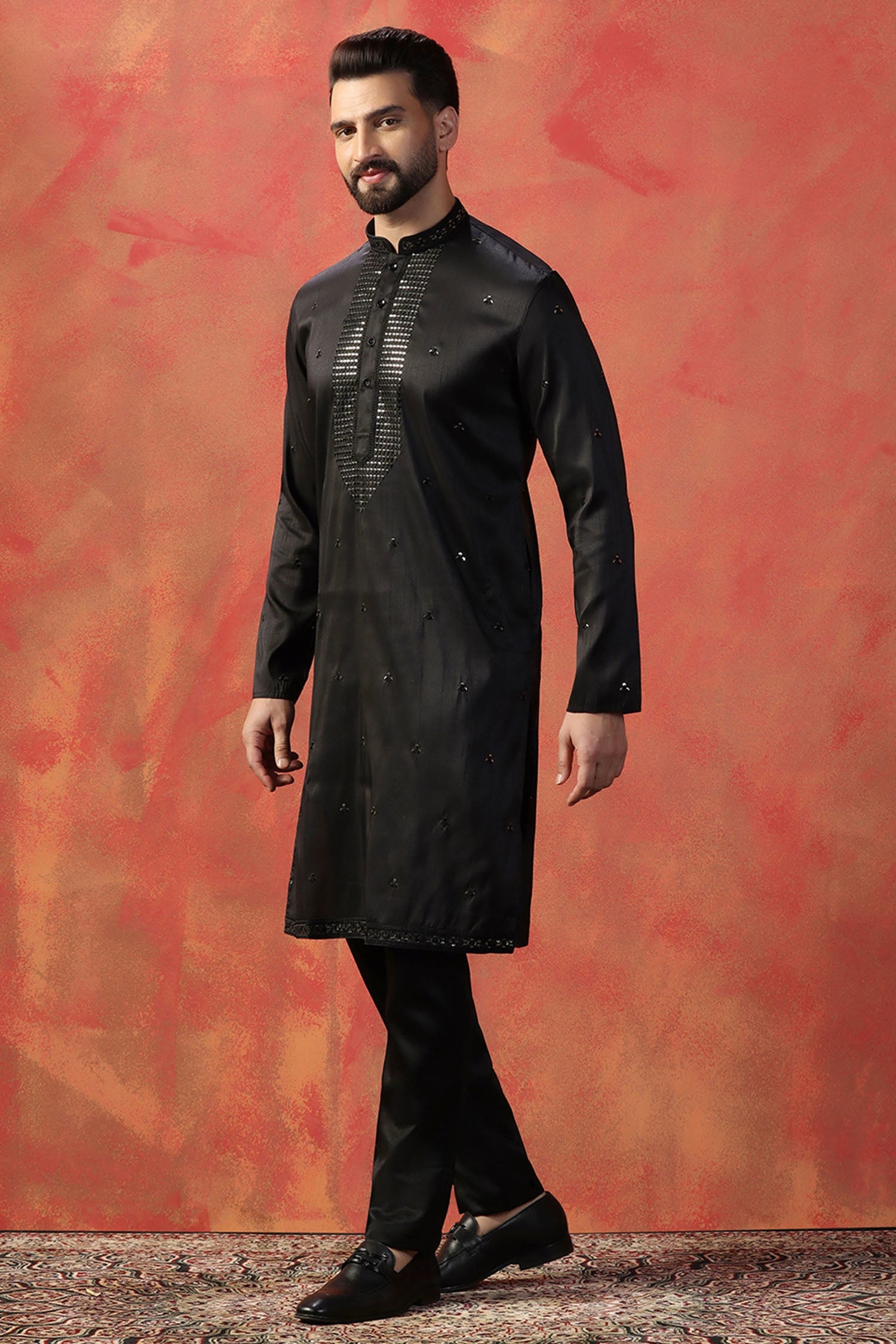 The embroidery work embellished on Raven Black silk blend kurta set with mandarin neckline complemented with full sleeves making it perfect for traditional occasions