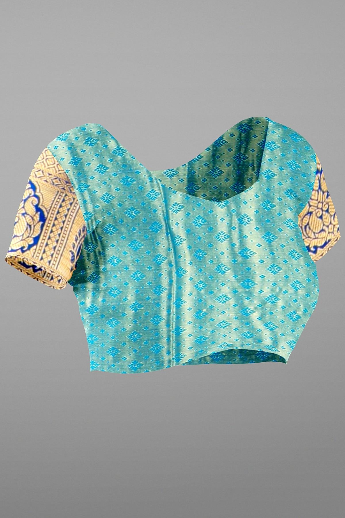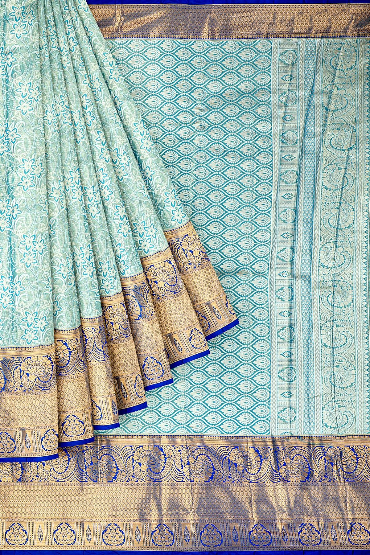 Latest SEA BLUE FLORAL JAAL TISSUE SILK Saree with SELF ZARI border. This saree comes with ZARI WOVEN TISSUE SILK blouse.
