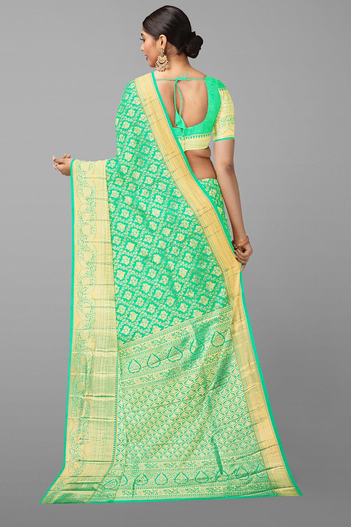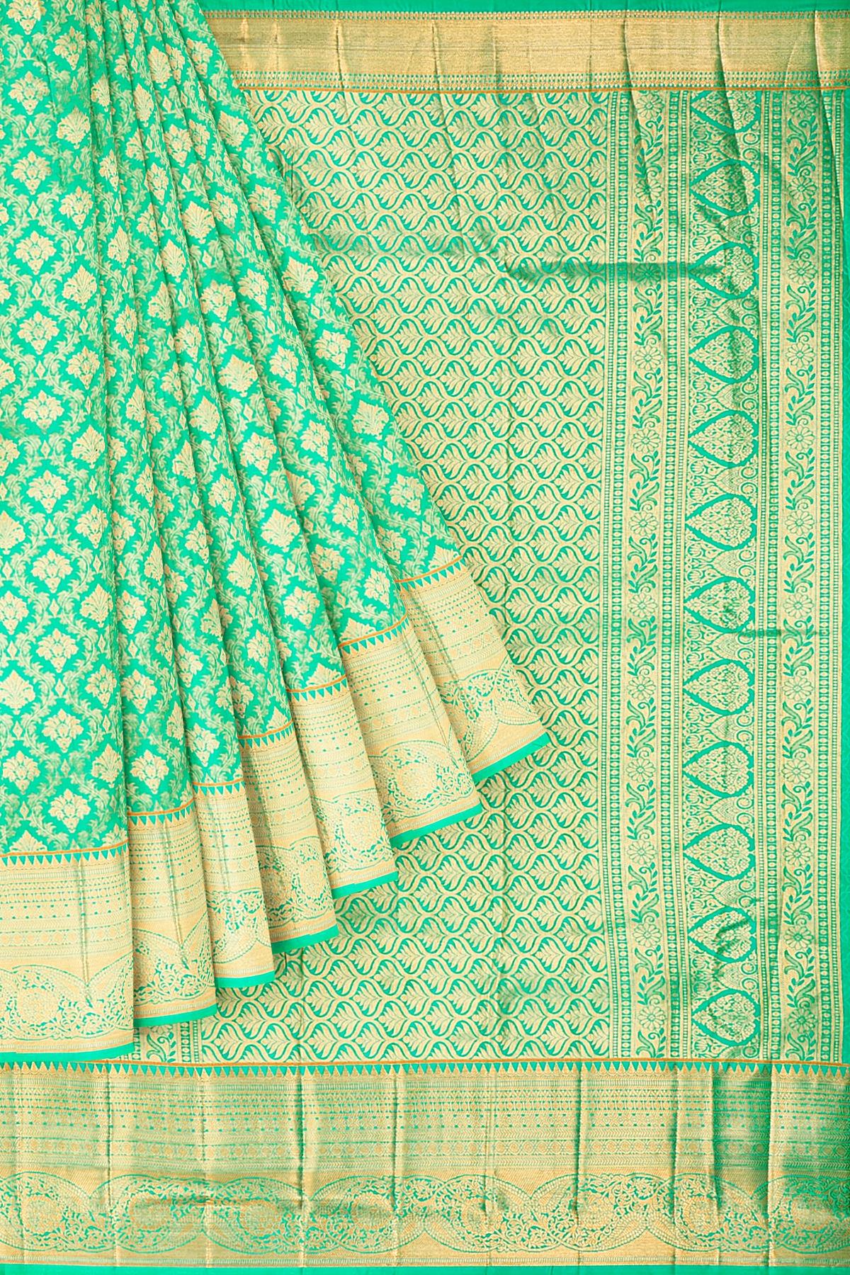 SEA GREEN and GOLD FLORAL JAAL SILK BLEND Saree with SEMI PATTU