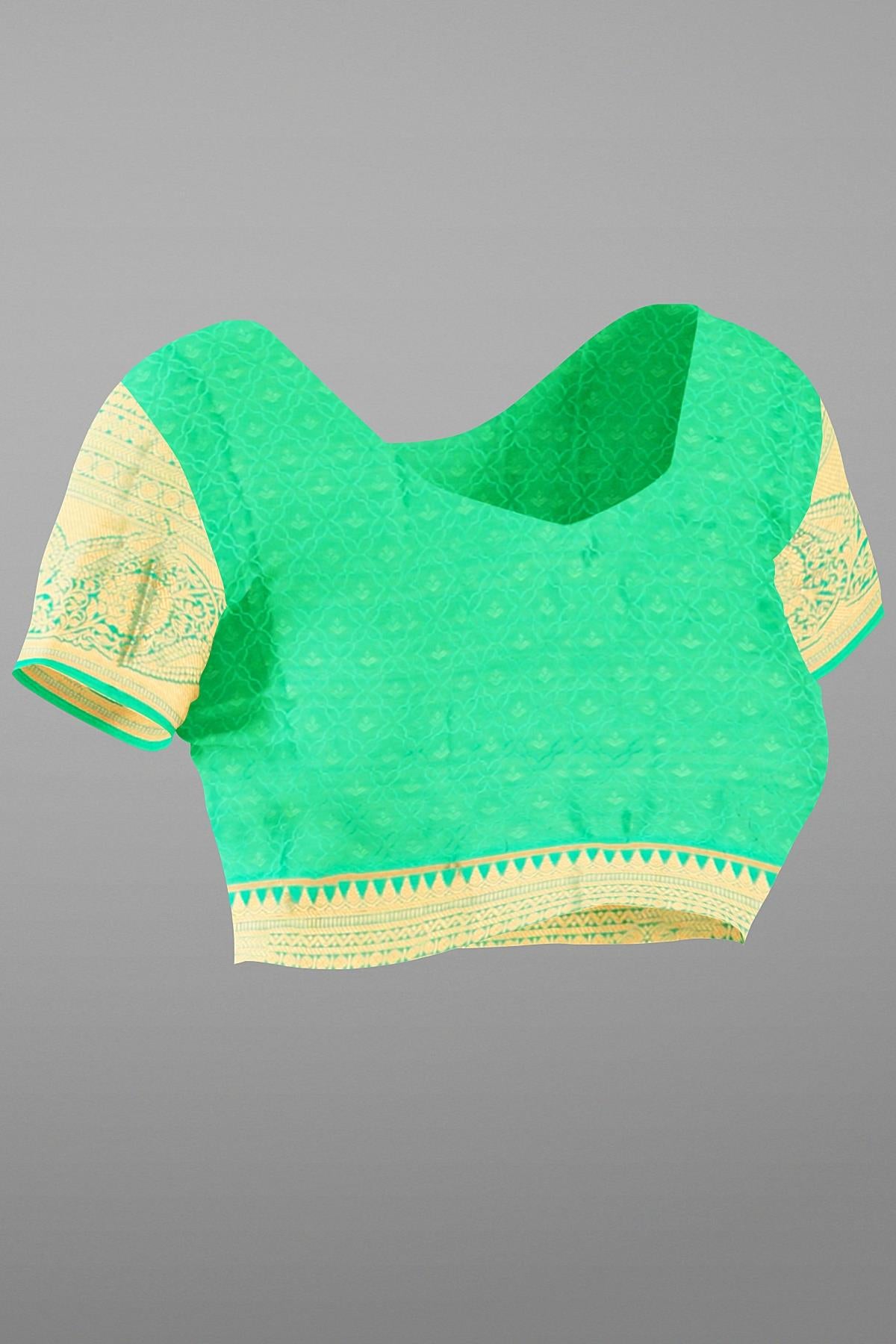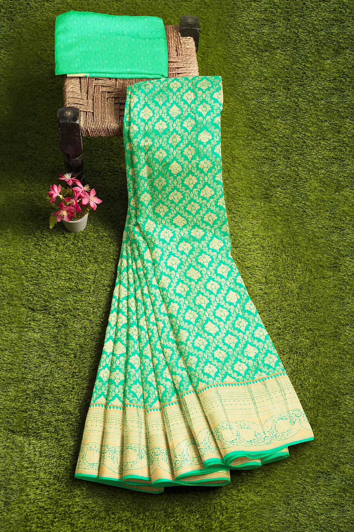 Latest SEA GREEN FLORAL JAAL SILK BLEND Saree with SELF ZARI border. This saree comes with EMBOSE SILK BLEND blouse.