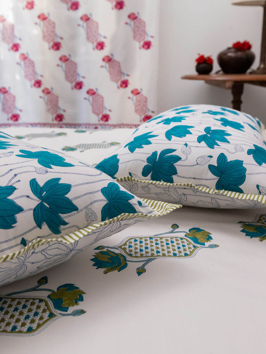 Padma or the Lotus is a central figure in many art forms including Pichhwai. It's a flower with meaning, beauty, and great cultural significance. The origin of the Lotus in Hindu mythology goes as far back as 'Samudra Manthan'. Its first association is with Lakshmi who also emerges from 'Samudra', hence, is referred to as Padmaja or Padmavati. This hand block printed home textiles collection is inspired by the beautiful lotus and other nature inspired elements.