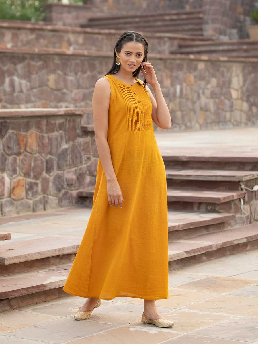 An A-line long cotton slub pintuck dress with handwoven cotton angrakha jacket featuring fine zari work and a dramatic flair. It can be left open or tied using the tassel strings provided on each side. Combine this with silver or oxidised jewellery and mojaris to complete the look. Both the dress and jacket can be used separately and styled in various ways. Our model is 5'8" and is wearing S. Note: Ships immediately.