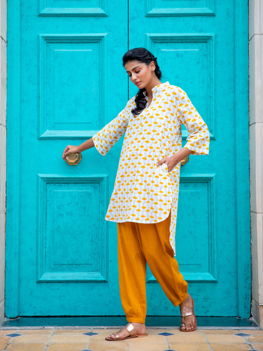 This lovely comfort-fit kurta and lantern pants set is perfect to wear at home, an easy stroll, coffee date, or casual brunch. The model is wearing an S size without any alterations.