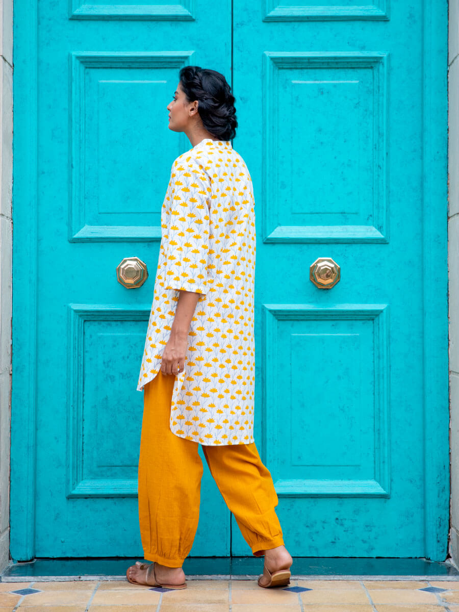 Cotton kurta; cotton slub lantern pants; hand printed with azo-free dyes