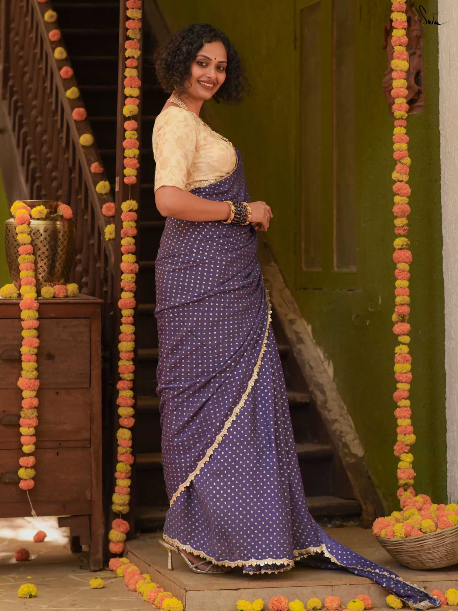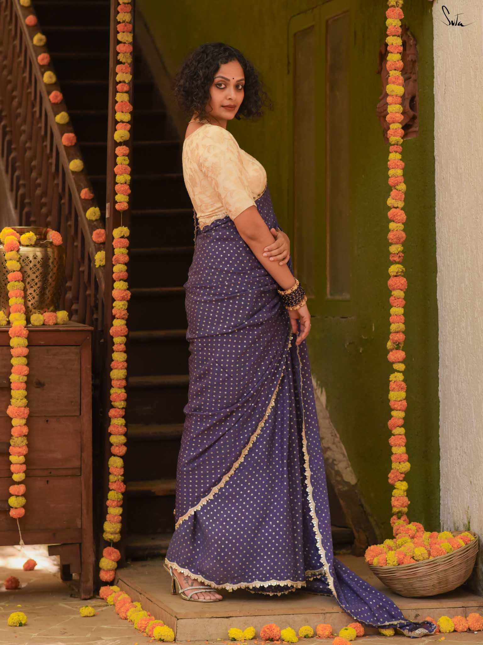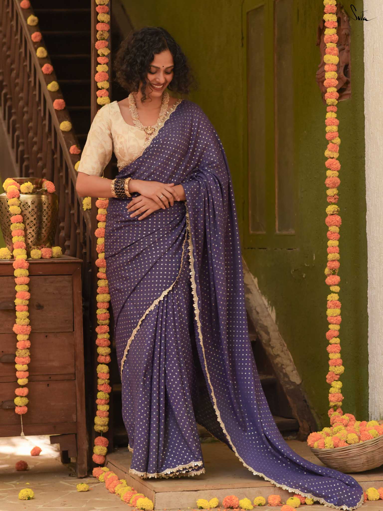 Elegant, deep, and undeniably gorgeous - this navy blue viscose-blend saree brings a refined glow to any occasion. The fluid drape is dotted with light gold woven buttis, adding a gentle sparkle that sits beautifully against the rich base. Finished with an embroidered scallop lace, the saree carries a polished, timeless charm perfect for evening weddings, cocktails, and grand celebrations.