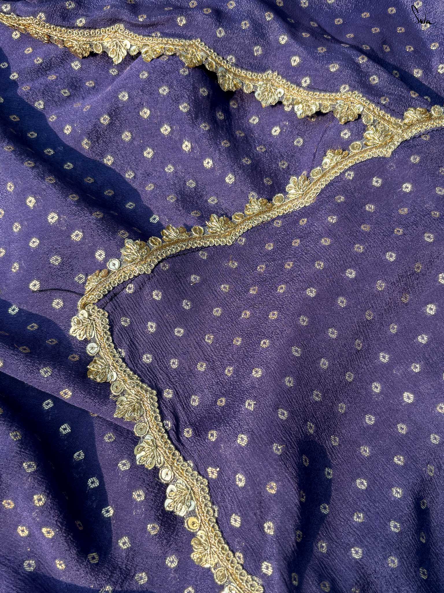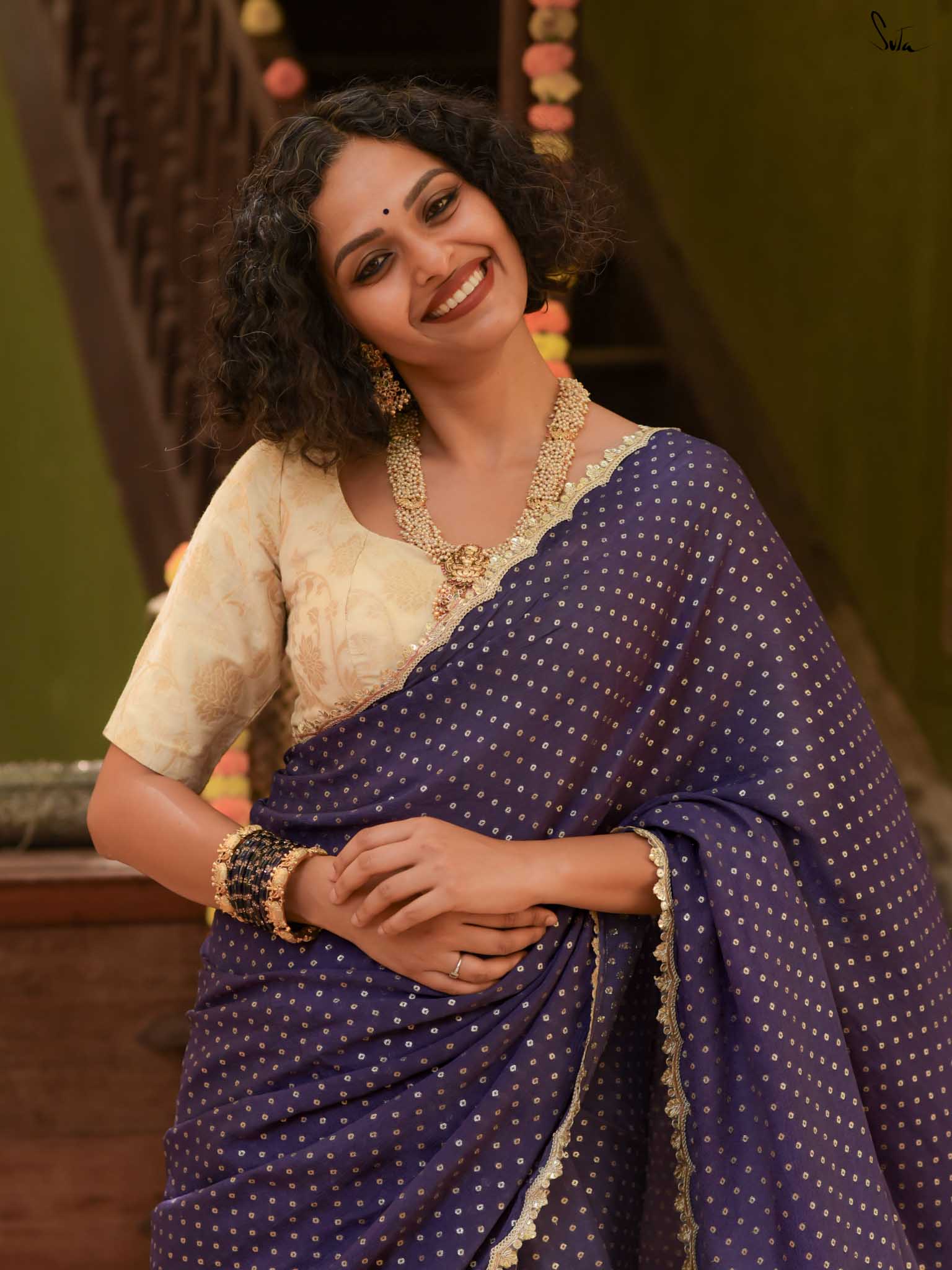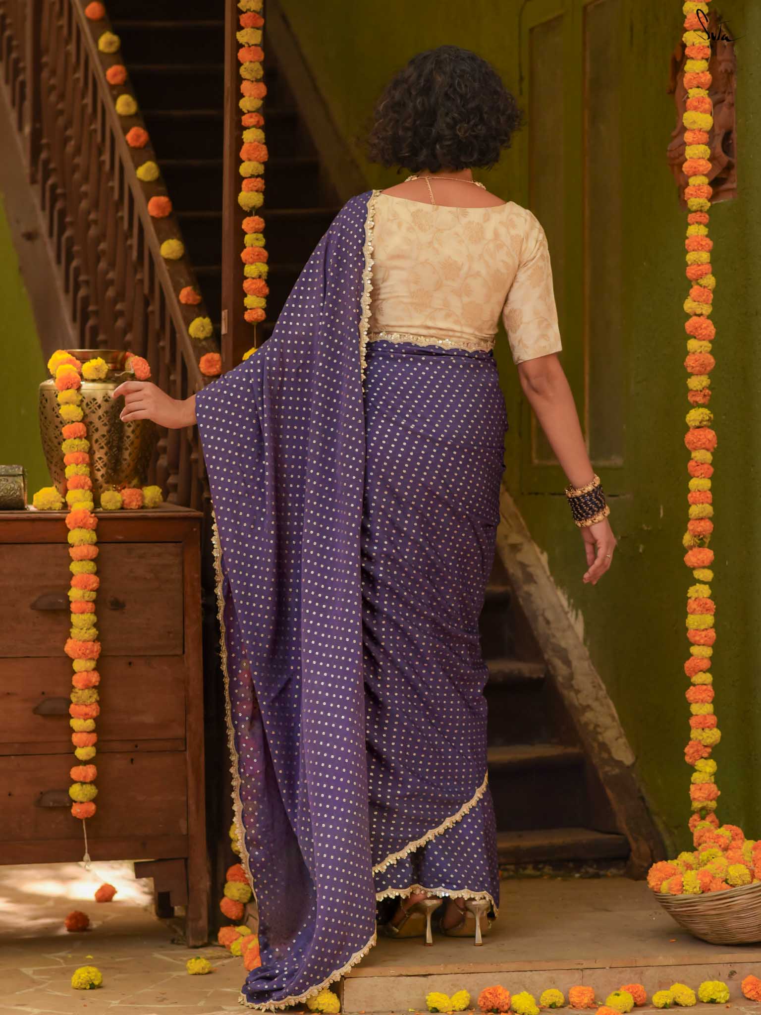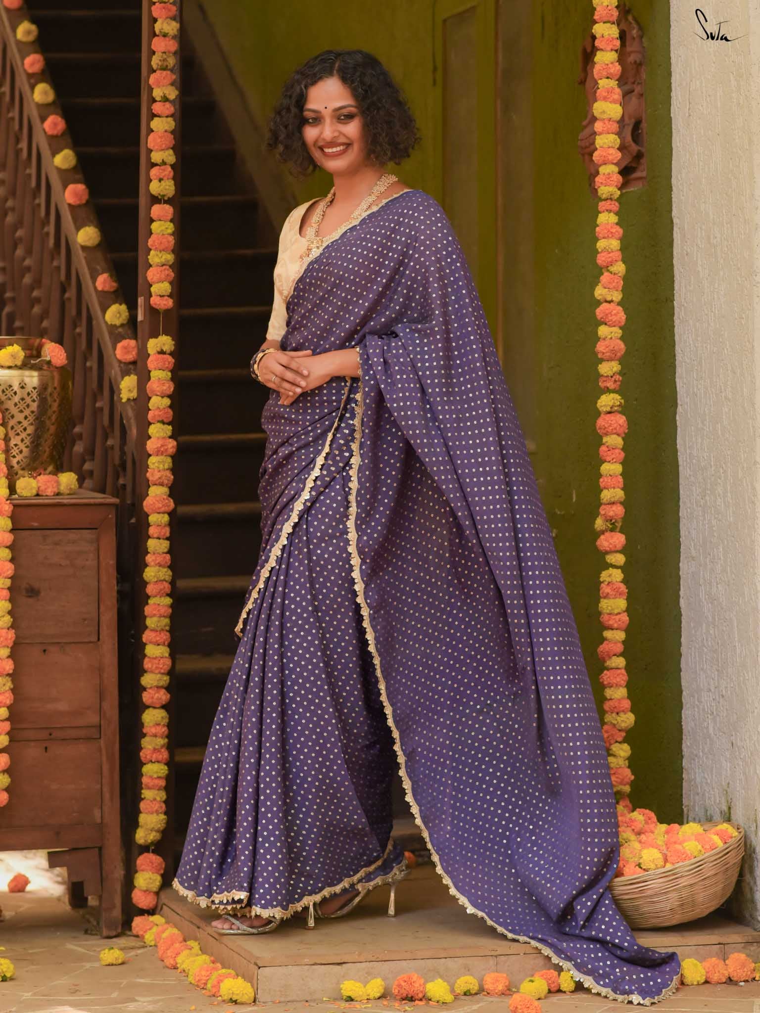 Elegant, deep, and undeniably gorgeous - this navy blue viscose-blend saree brings a refined glow to any occasion. The fluid drape is dotted with light gold woven buttis, adding a gentle sparkle that sits beautifully against the rich base. Finished with an embroidered scallop lace, the saree carries a polished, timeless charm perfect for evening weddings, cocktails, and grand celebrations.