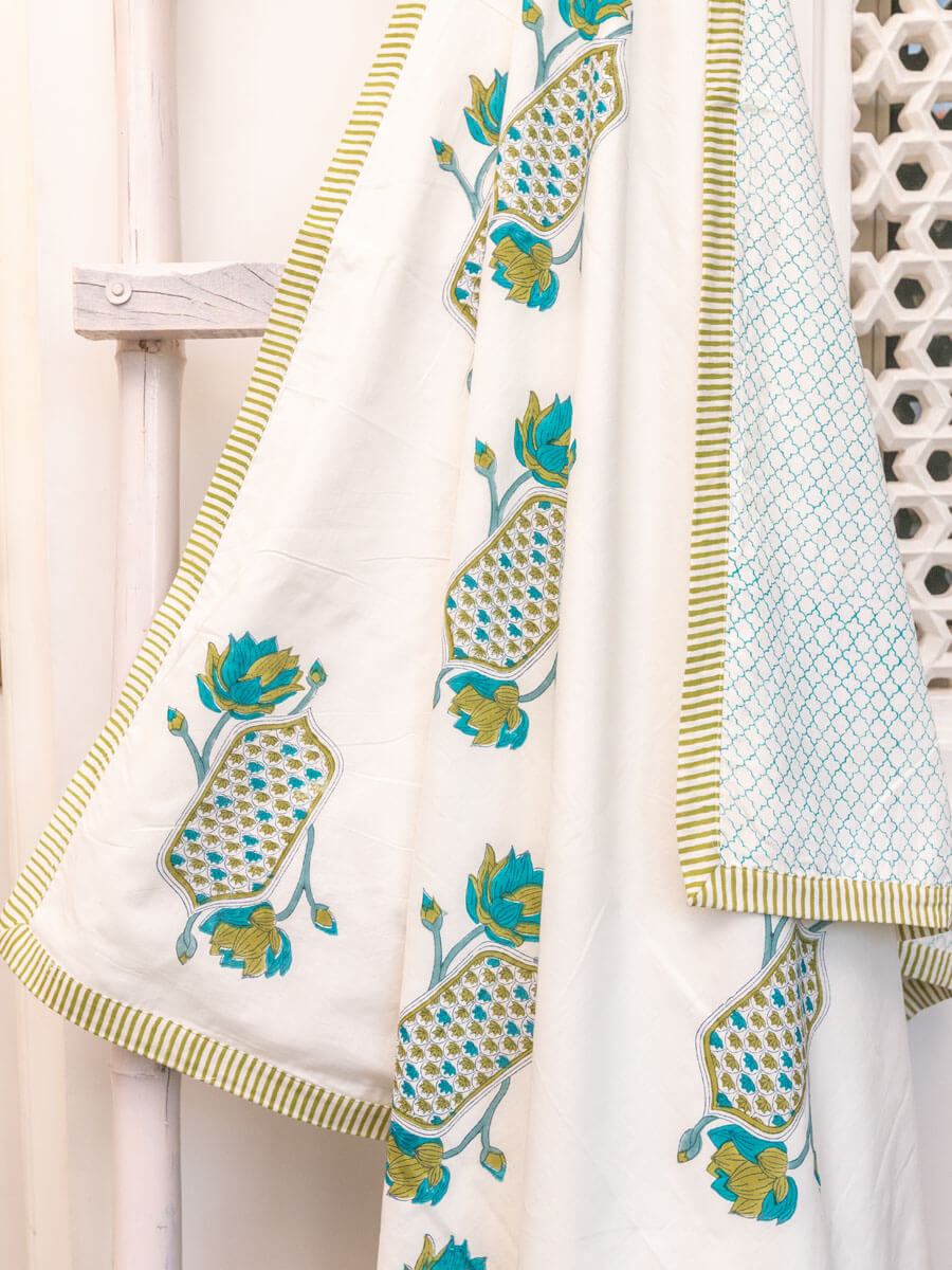 Padma or the Lotus is a central figure in many art forms including Pichhwai. It's a flower with meaning, beauty, and great cultural significance. The origin of the Lotus in Hindu mythology goes as far back as 'Samudra Manthan'. Its first association is with Lakshmi who also emerges from 'Samudra', hence, is referred to as Padmaja or Padmavati. This hand block printed home textiles collection is inspired by the beautiful lotus and other nature inspired elements.