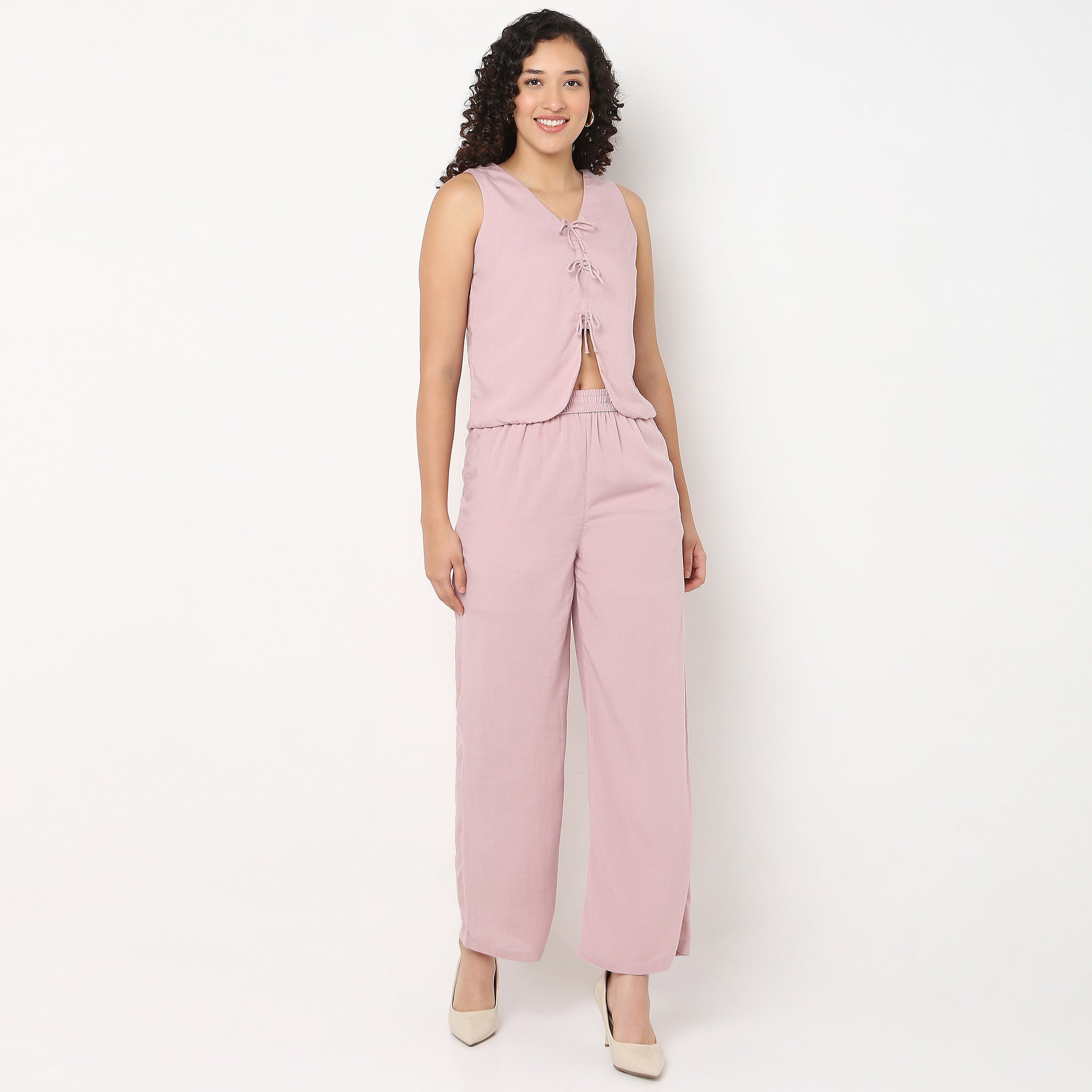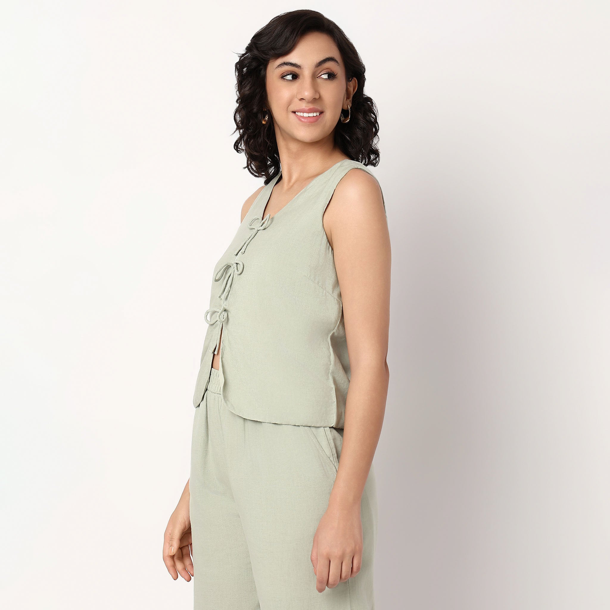 Experience the perfect blend of comfort and style with our V-Neck Top with Front Tie-Up Detail. Crafted from a luxurious Viscose Cotton Flex fabric, this top offers a soft touch against your skin while maintaining a chic, solid pattern that complements any wardrobe. The sleeveless design and V-neckline add a touch of elegance, making it ideal for both casual outings and more formal occasions. Whether you're heading to a brunch or a business meeting, this top ensures you look effortlessly put together.