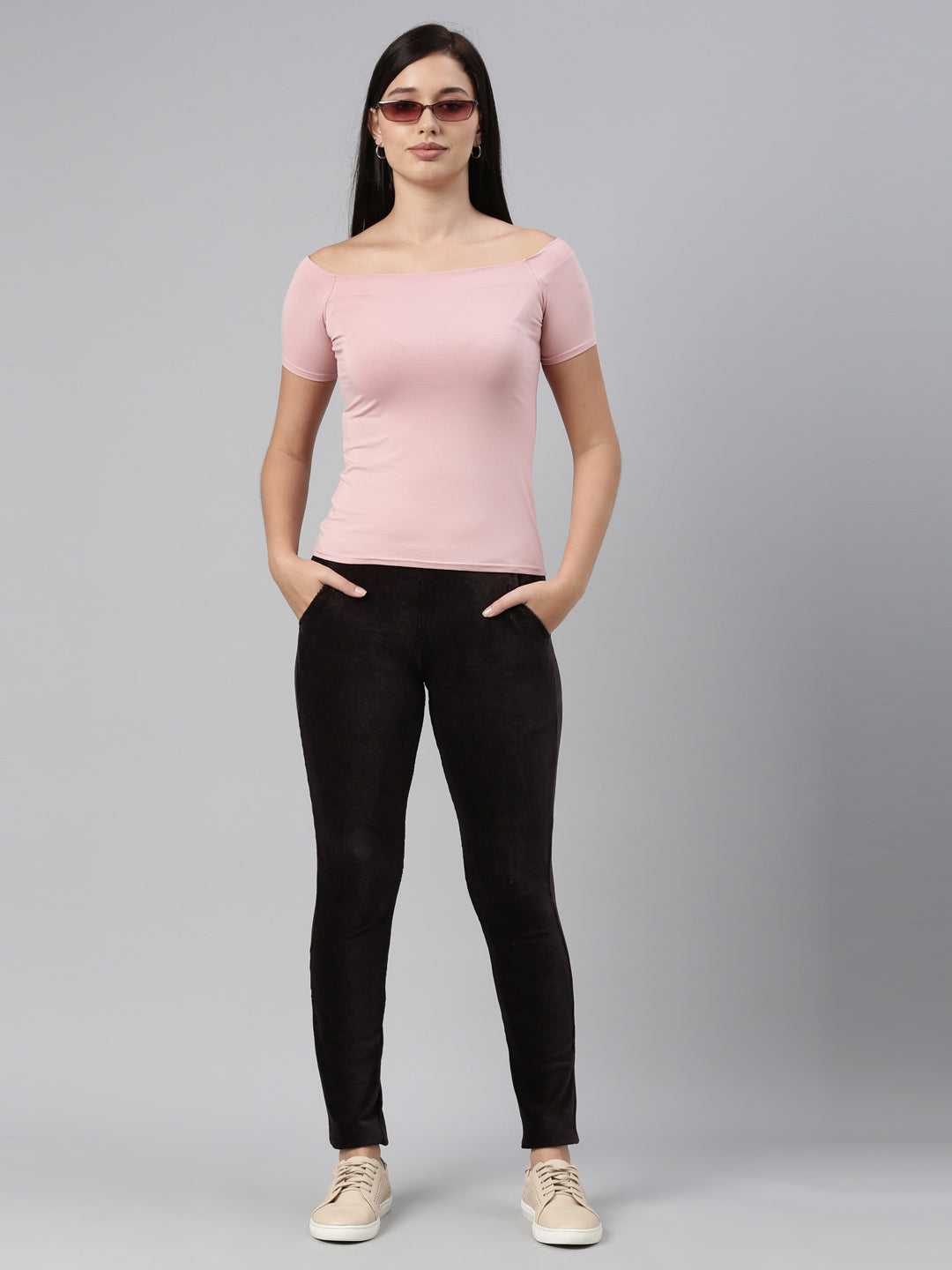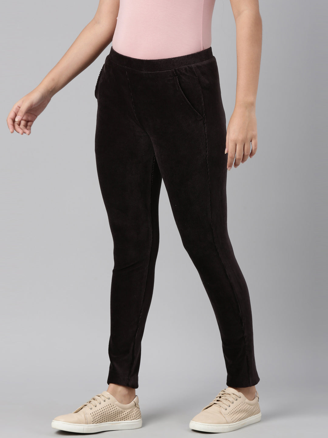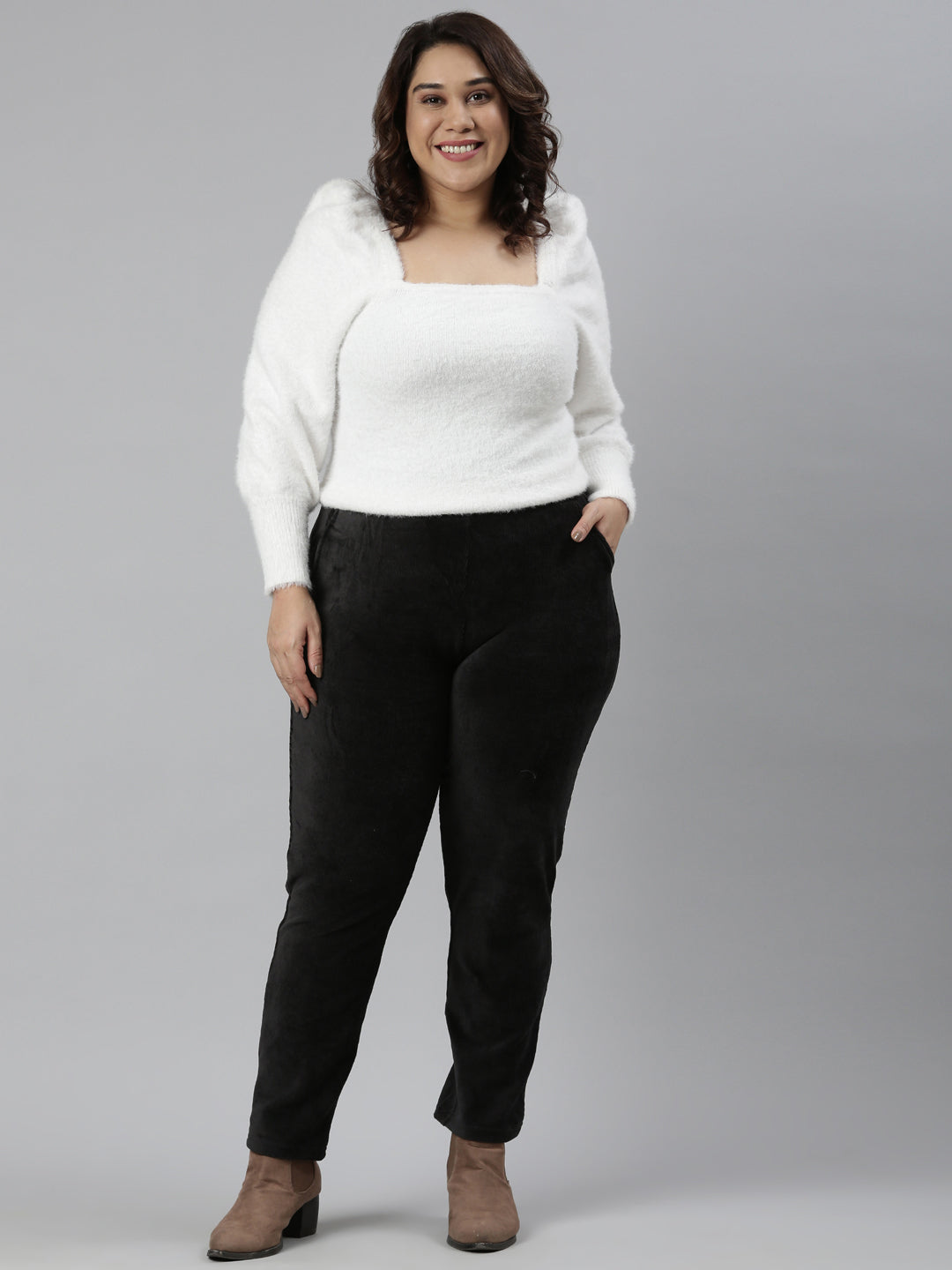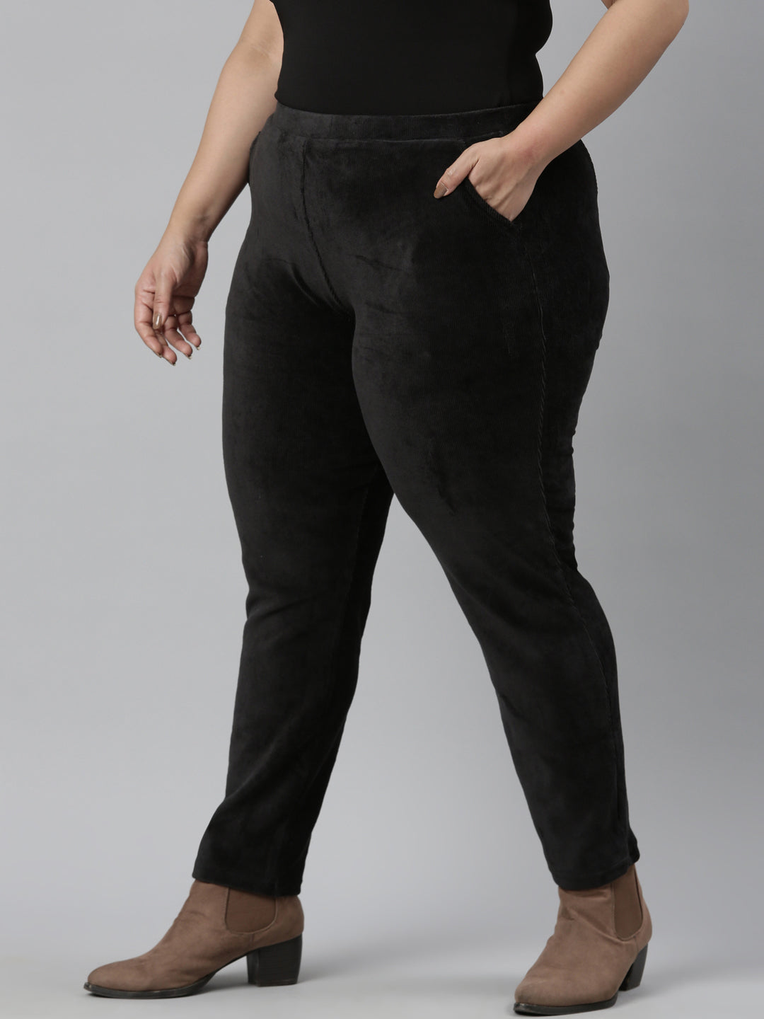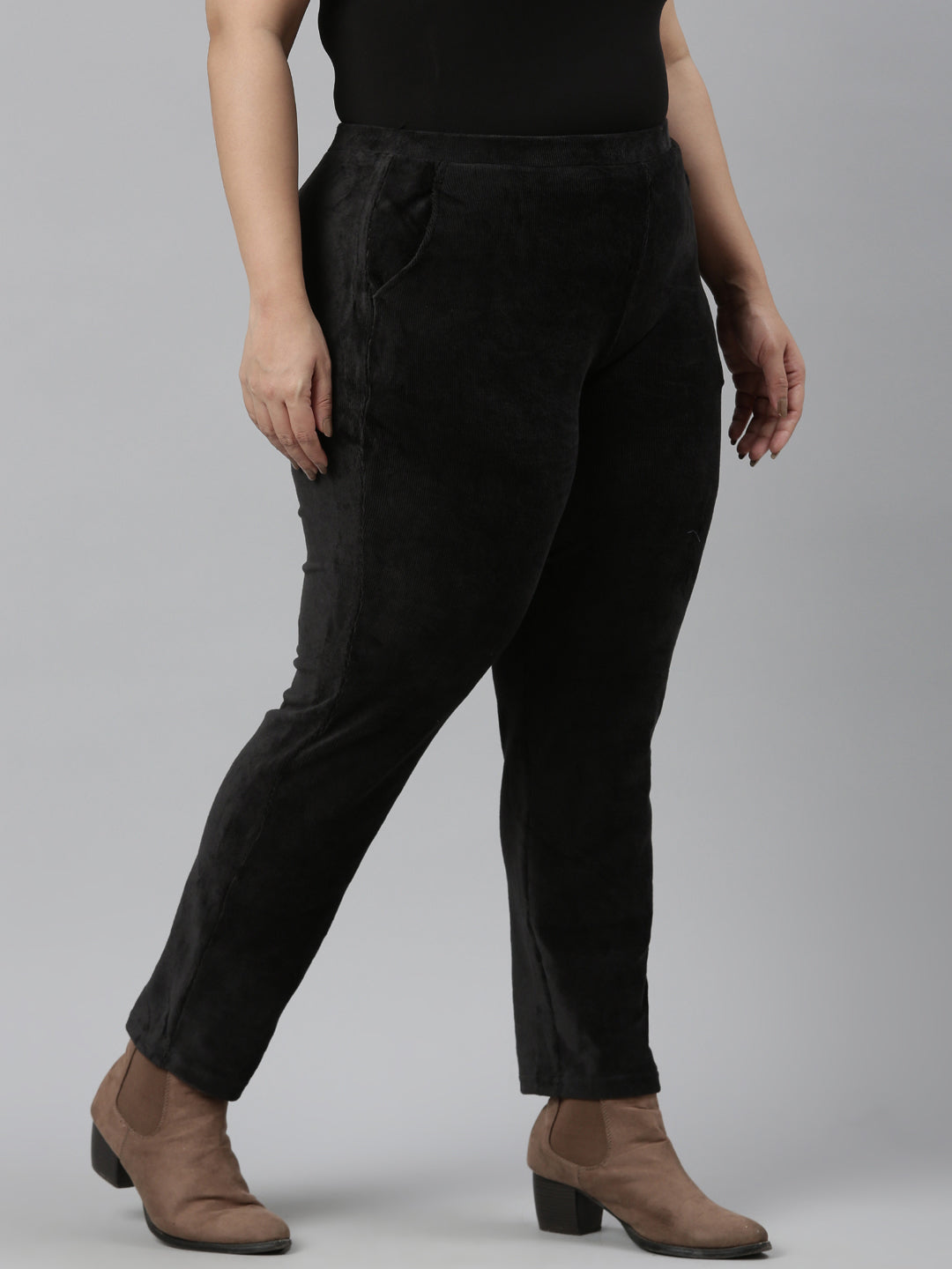 Bundle up in freezing temparatures in the Solid Black Corduroy Jeggings. Made from cotton, polyester & PU, the slip on trousers have a elasticised waistband, slant pockets & a tapered fit.