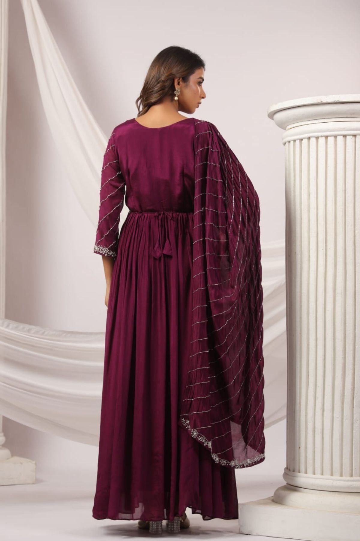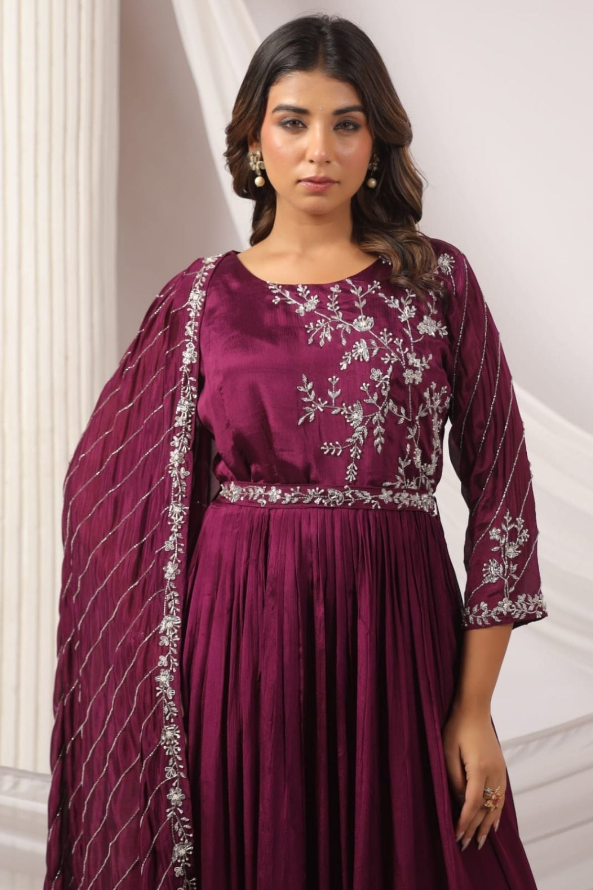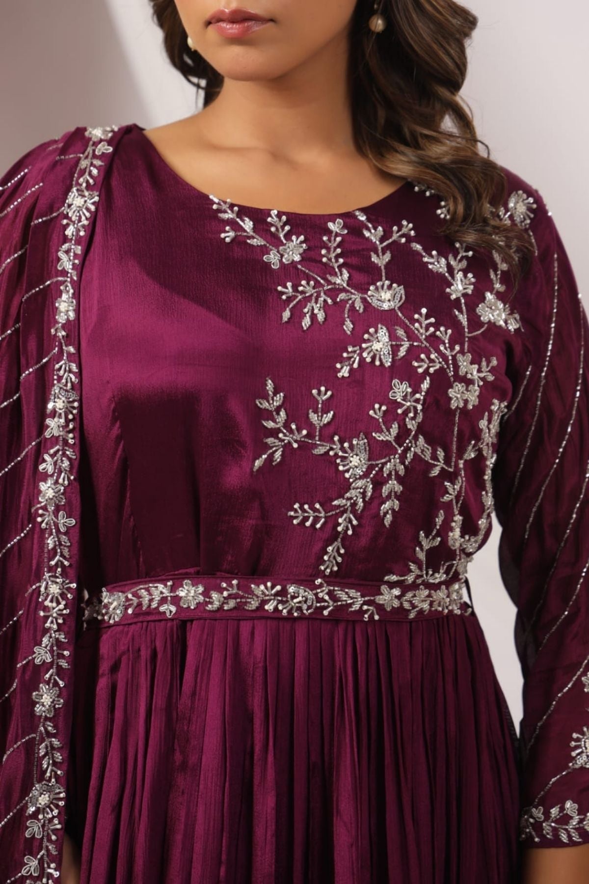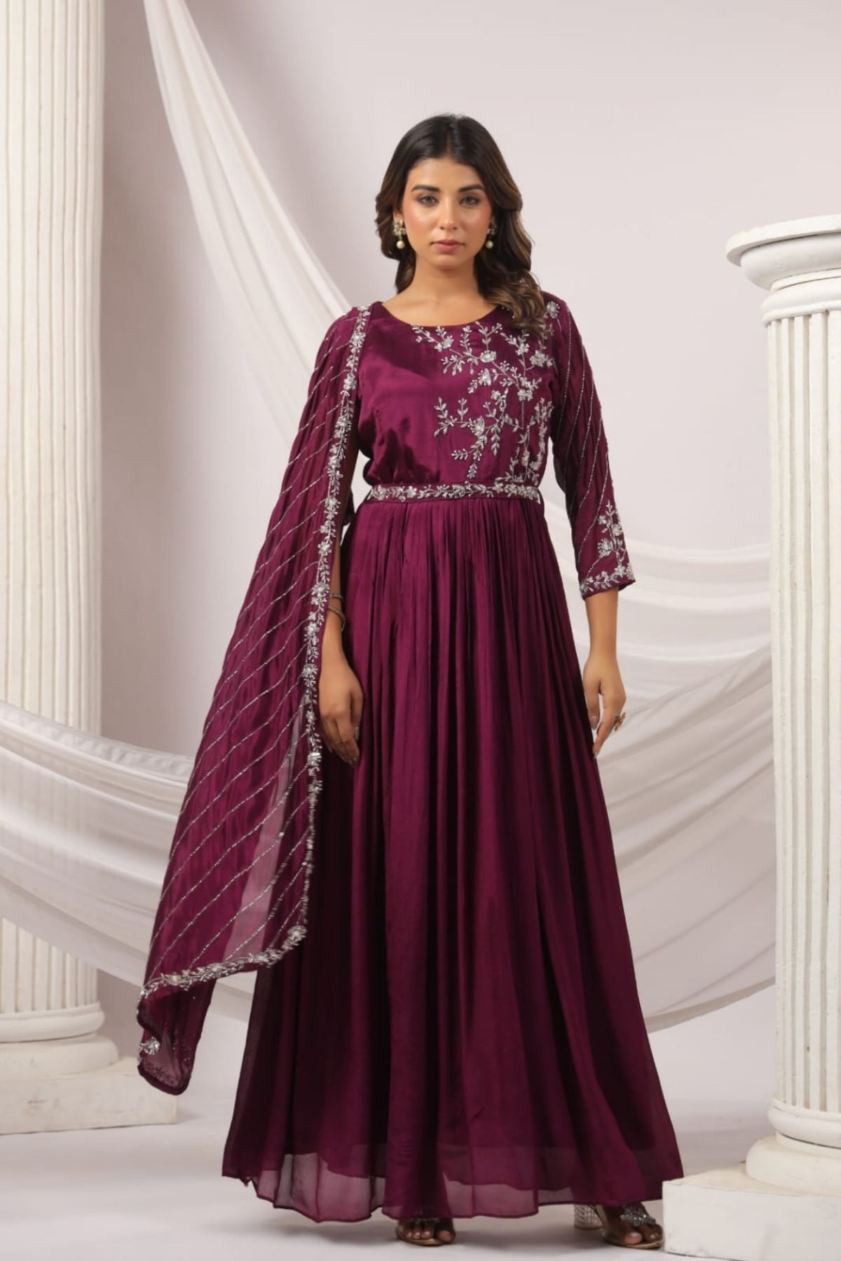 Featuring intricate zari detailing, this party wear gowns is a perfect fit for weddings, receptions, or festive evenings.